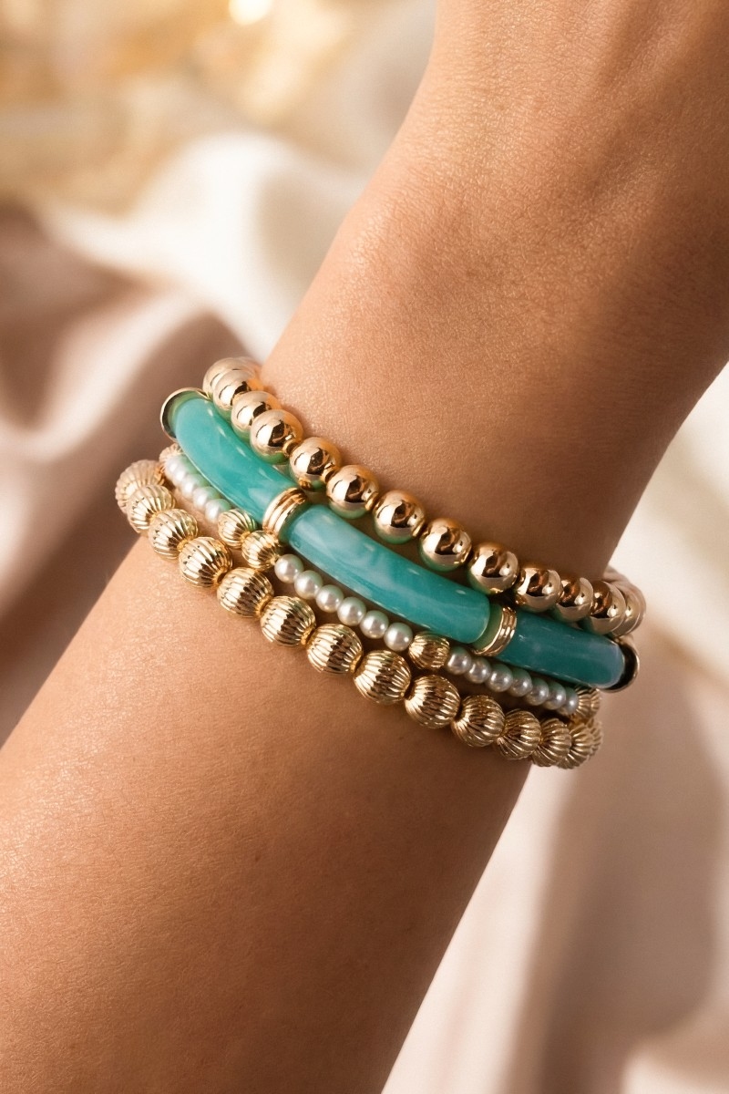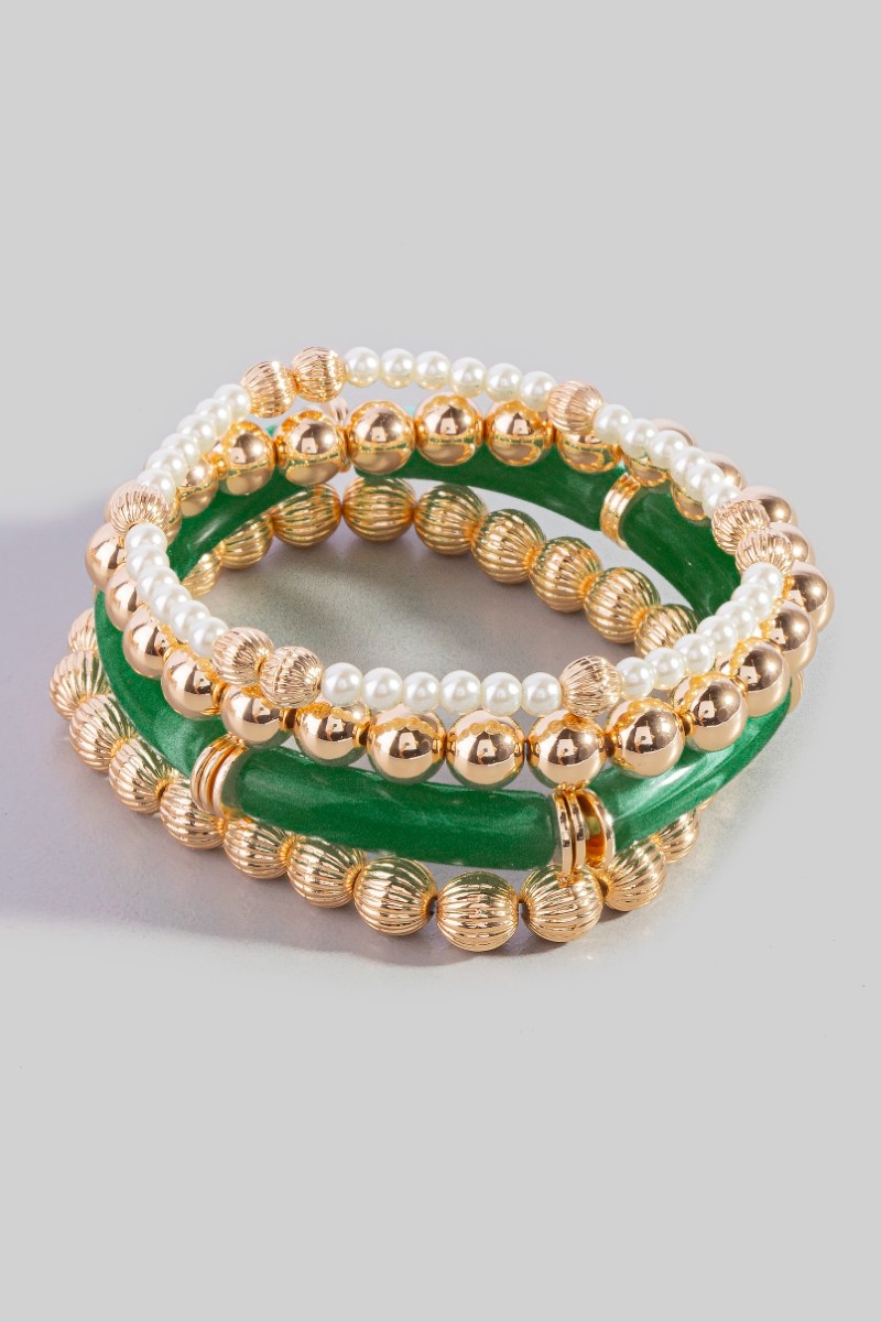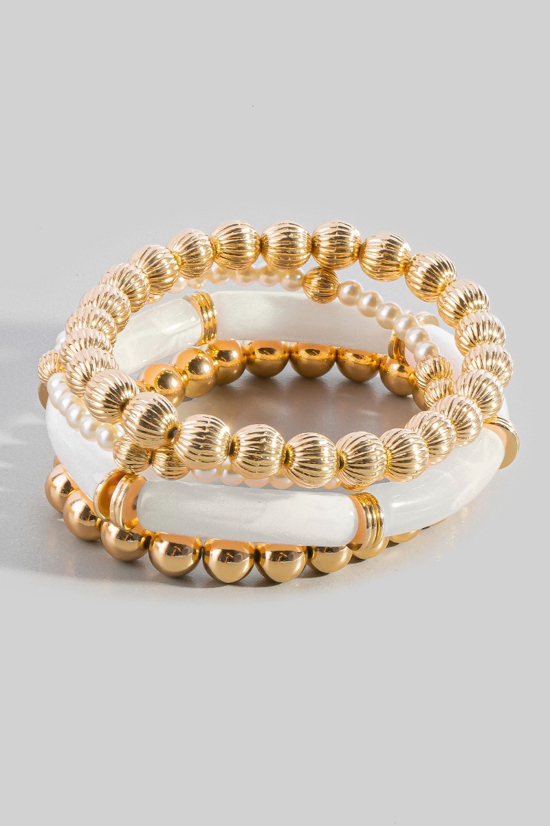 - This stretch bracelet showcases a timeless resin bar and gold bead set style. Explore a refined sense of style with this stretch bracelet, seamlessly elevating the chic factor of your look.