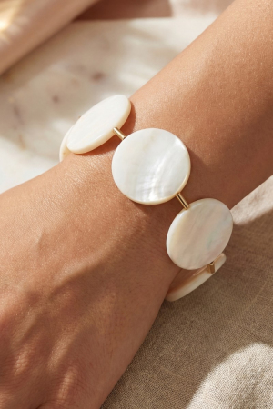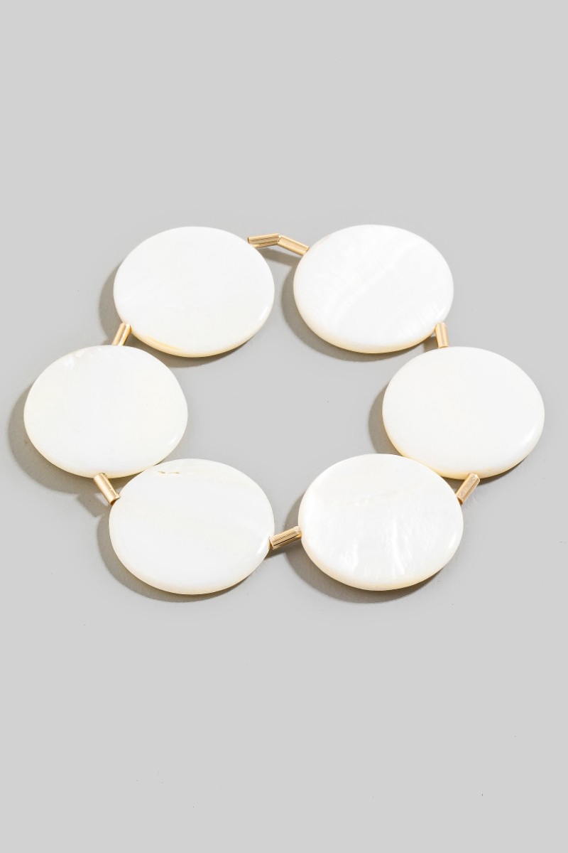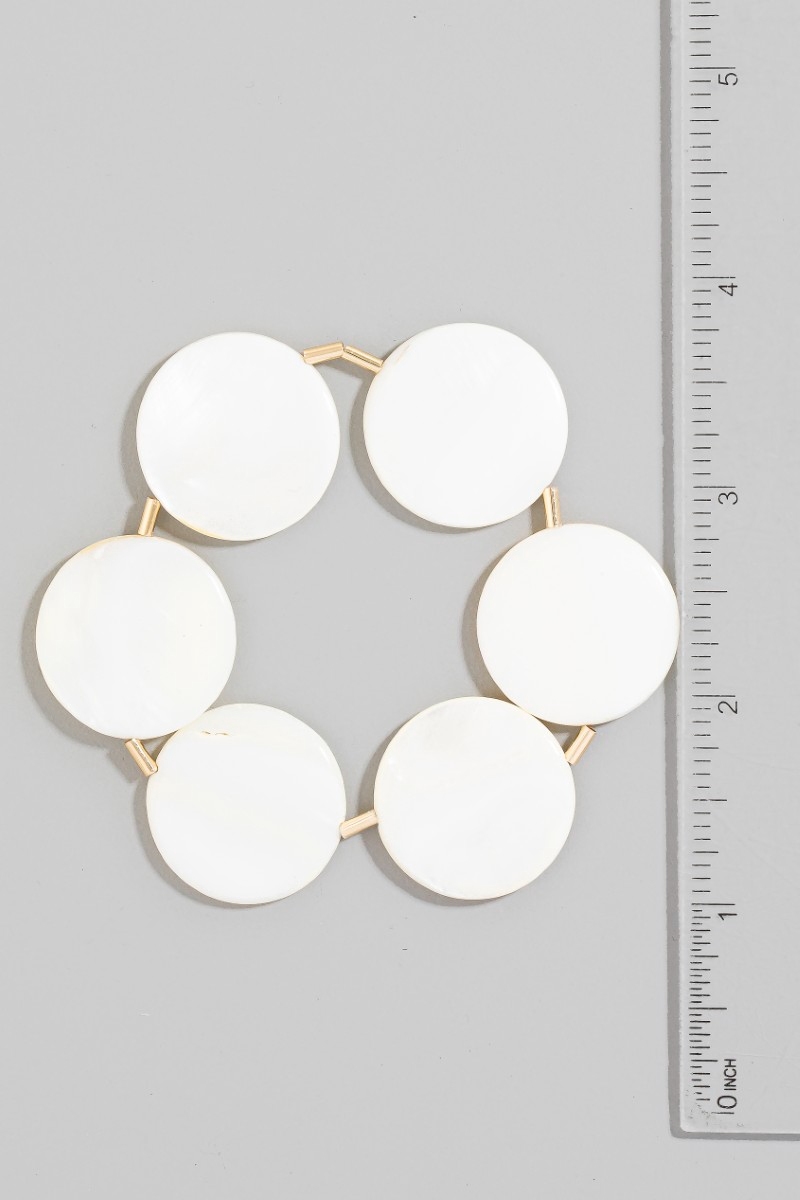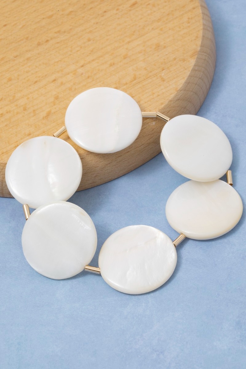 - This bracelet displays a vibrant seashell disc link style. Revel in the intricate design that effortlessly distinguishes this bracelet, making it a statement piece.