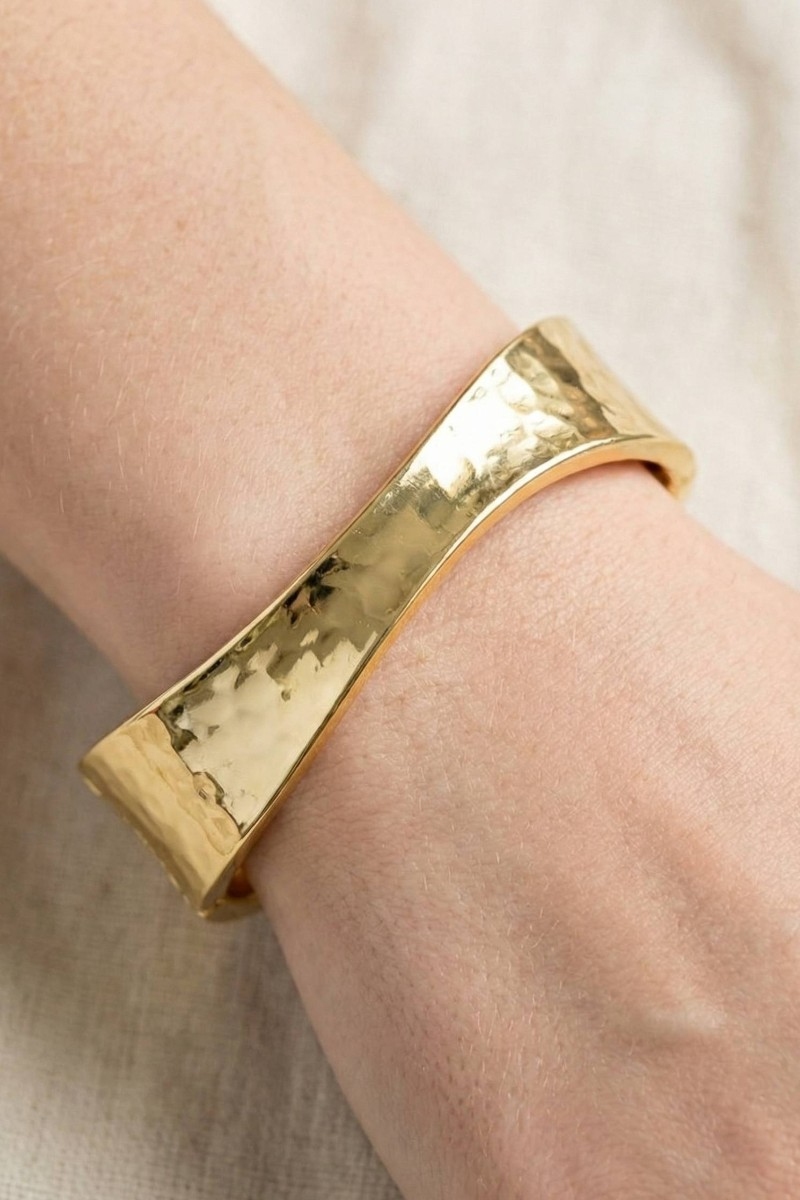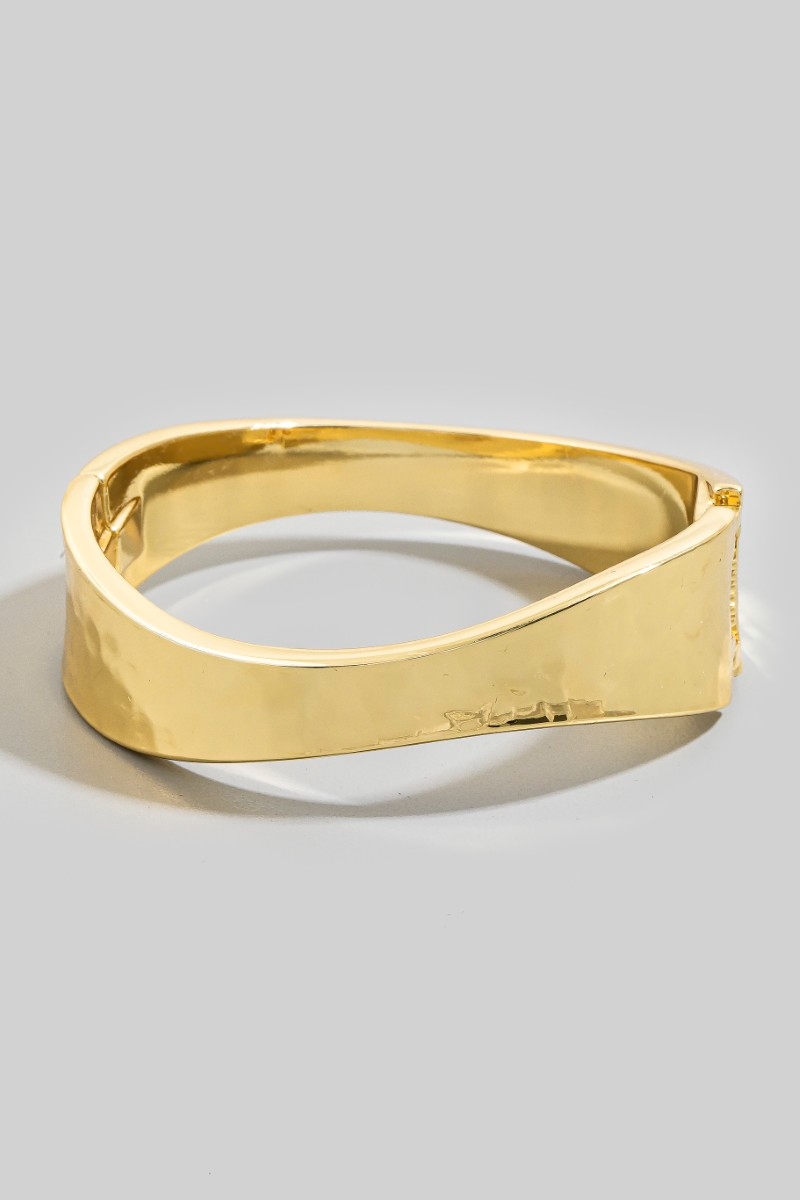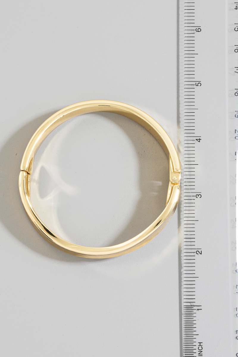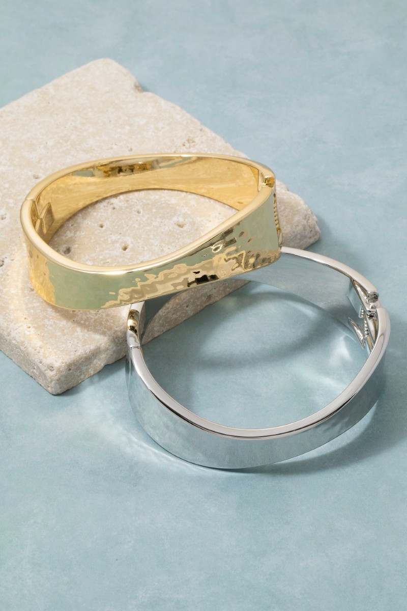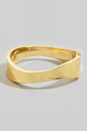 - This bangle bracelet brings a luxurious sleek sculptural hinged style. Witness the transformative power of accessories as this piece effortlessly redefines your fashion narrative.