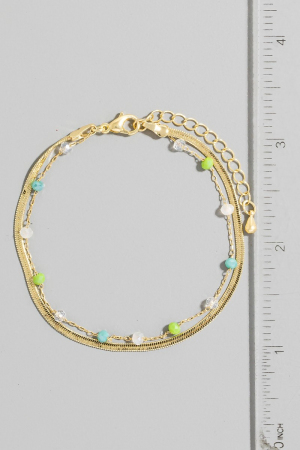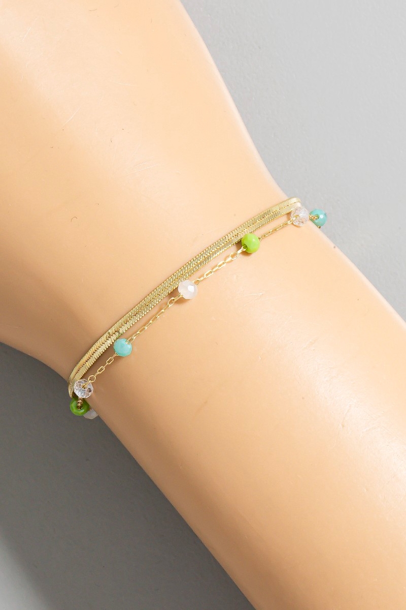 - This bracelet brings a unique faceted glass beads and snake chain layered style. Indulge in the artistry of accessorizing with this unique piece.
