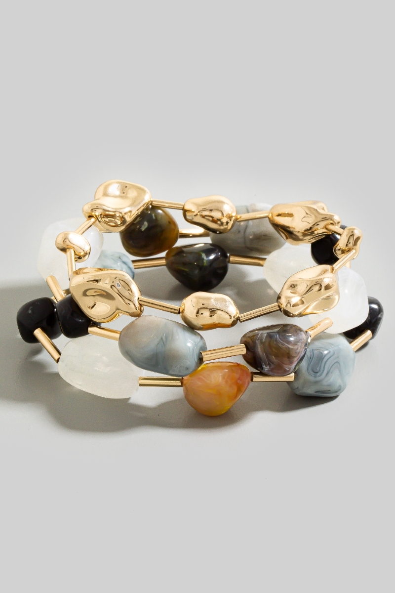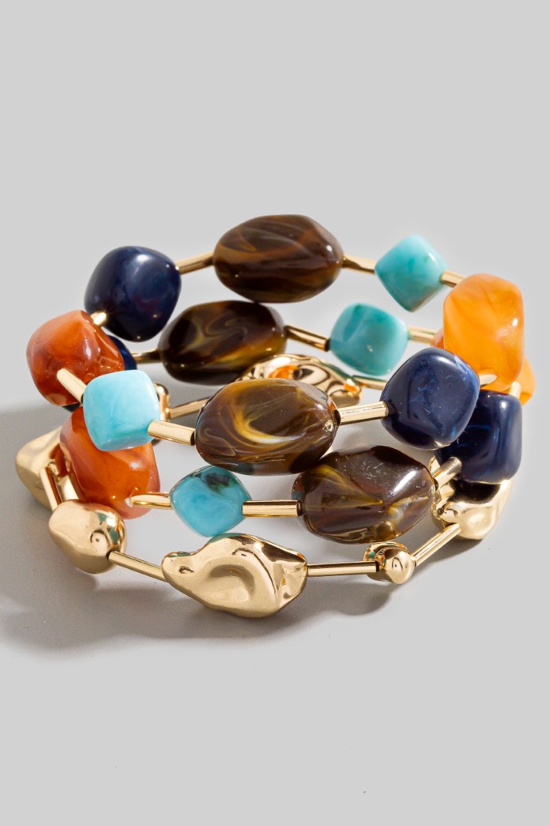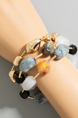 - This bracelet showcases a unique irregular metallic and acrylic beaded set style. Experience a burst of creativity in accessorizing as this piece effortlessly sets the tone for your unique style.