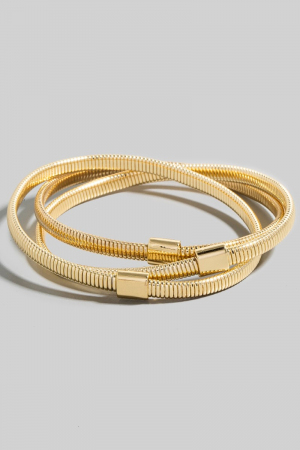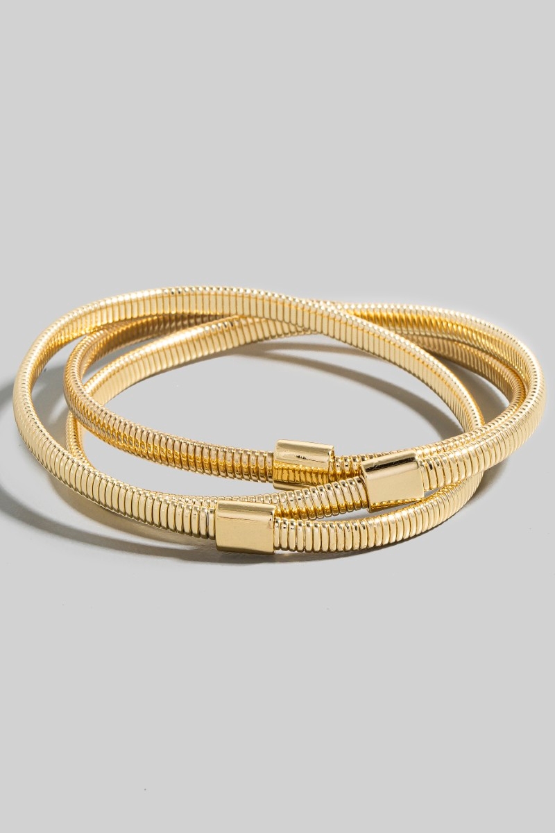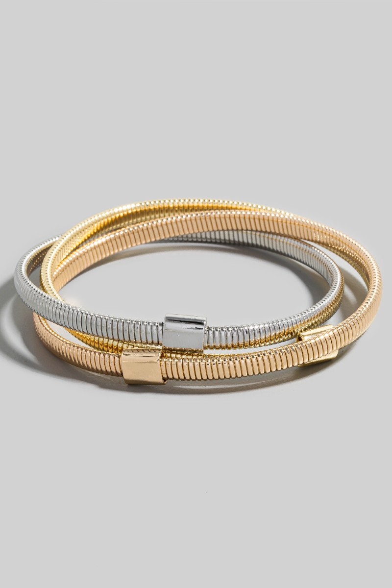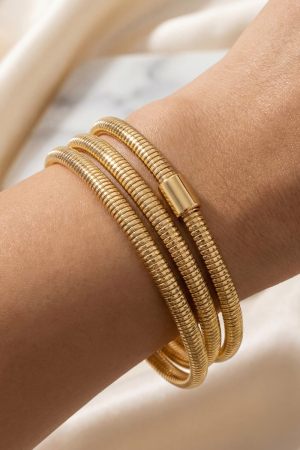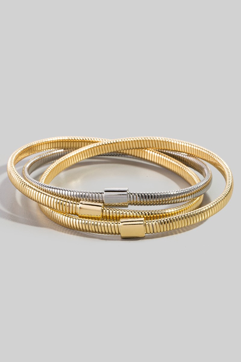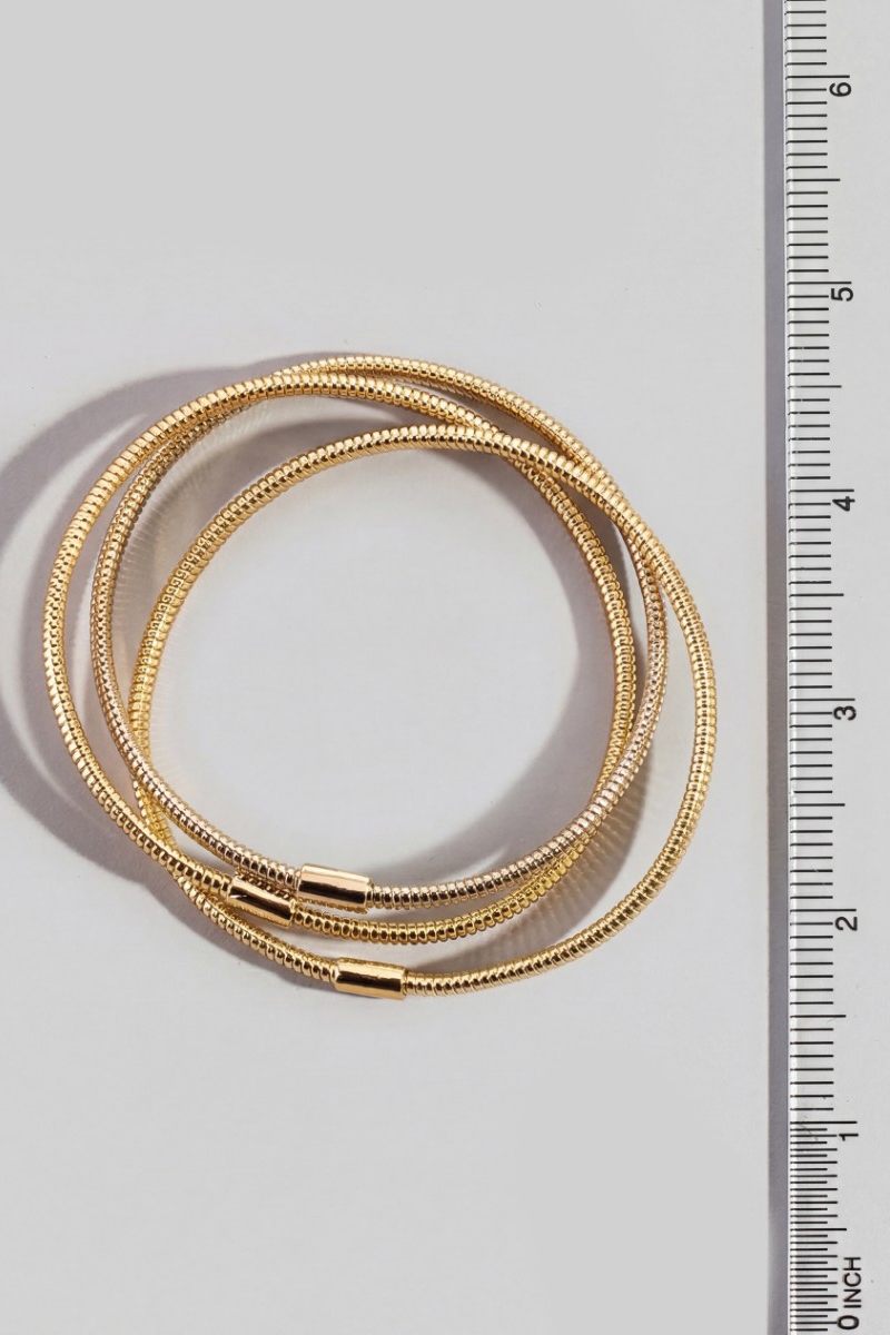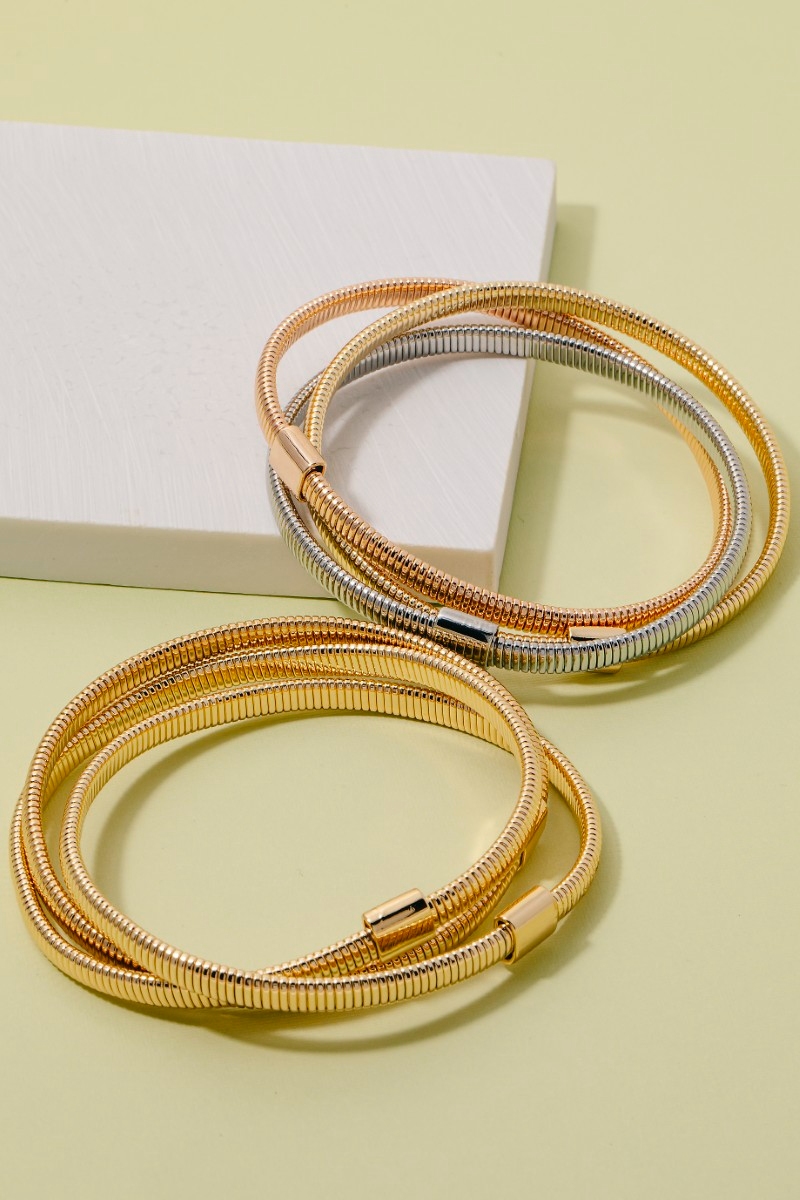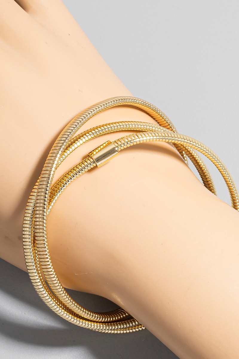 - This bracelet set introduces a unique layered coiled metallic bracelets set style. Step into a world of refined taste as this bracelet set effortlessly refines the details of your outfit.