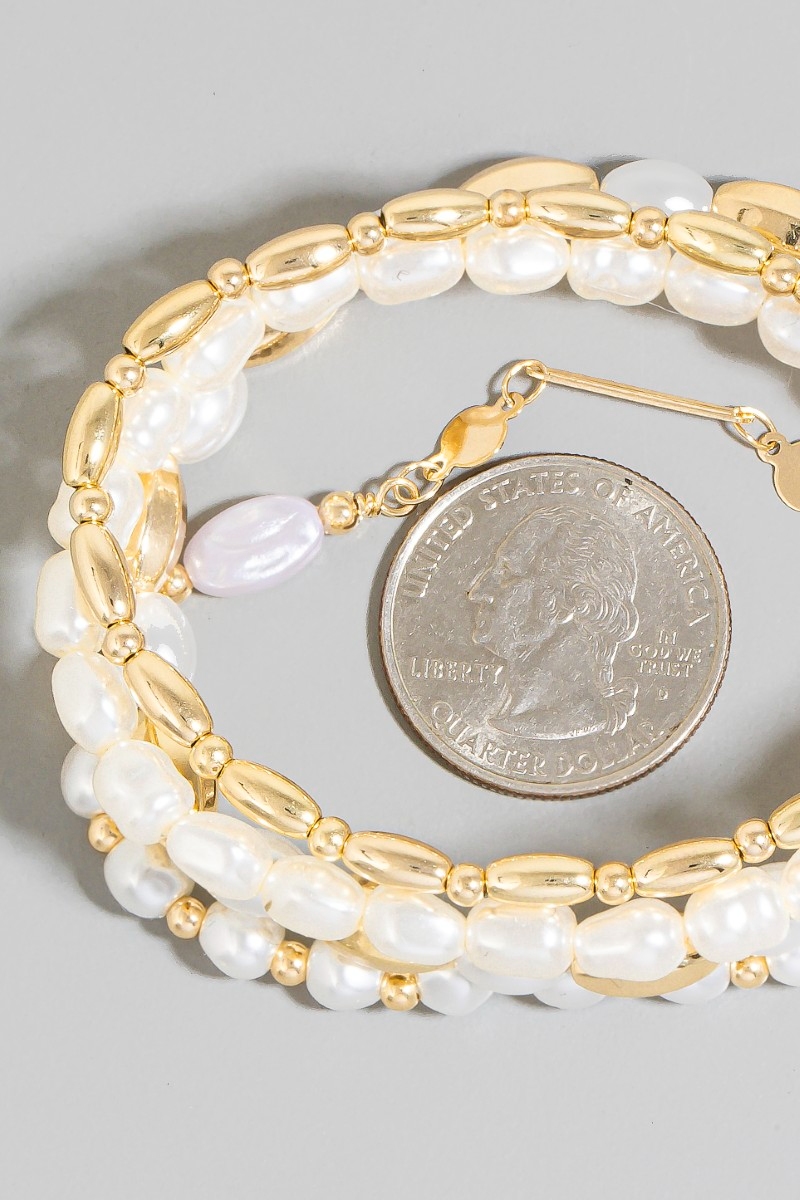 • This stackable bracelet showcases a unique mixed pearl and metallic beaded bracelet set style. Discover the perfect balance of subtlety and flair as this stackable bracelet effortlessly completes your look.