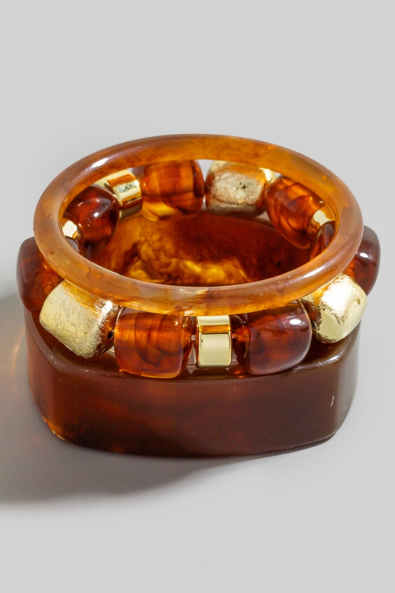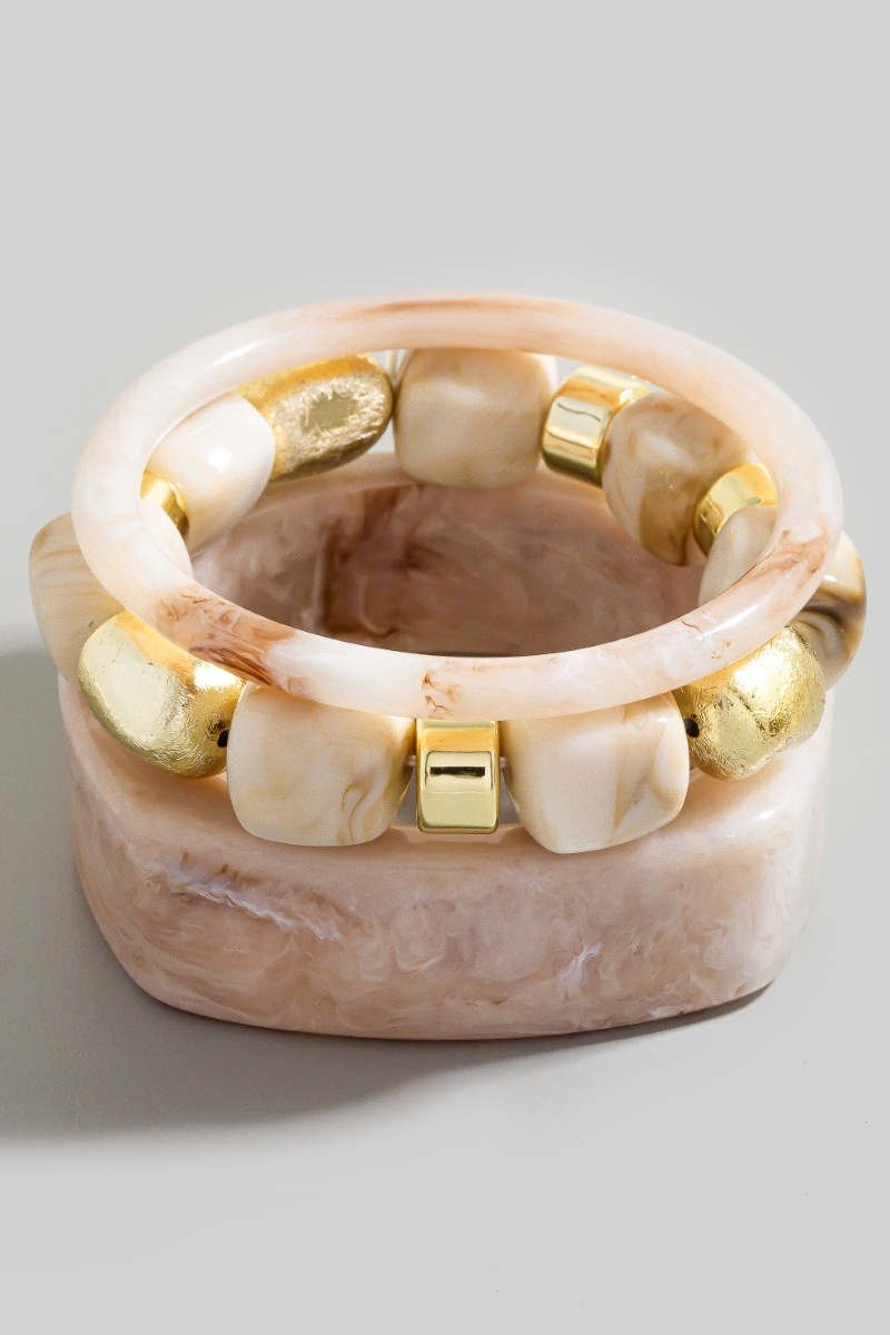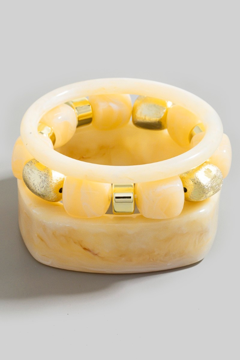 • This bracelet displays a fashionable mixed square resin bangle and beads set style. Experience the joy of accessorizing with this piece that effortlessly combines versatility and charm.