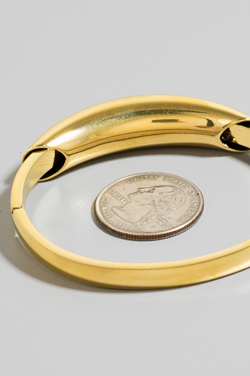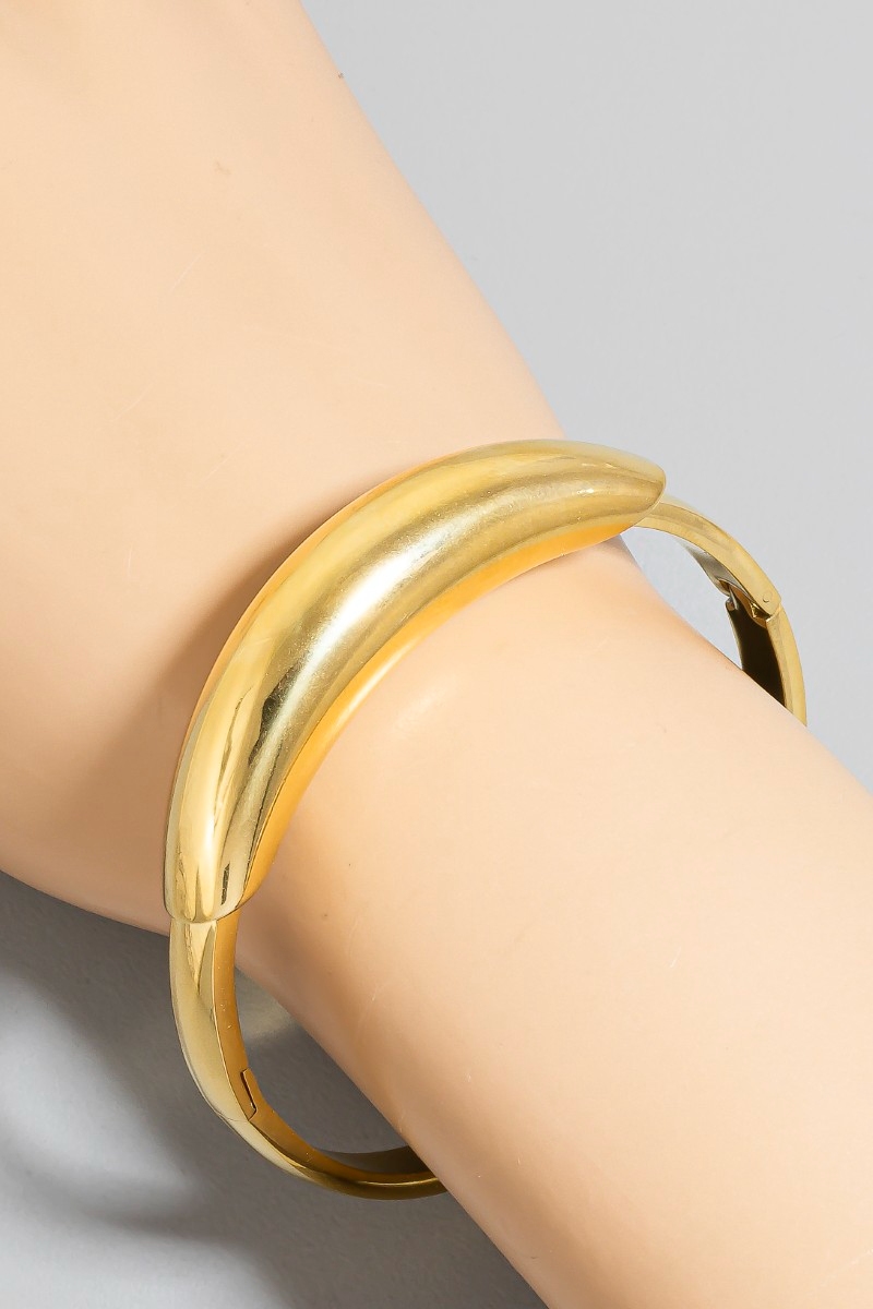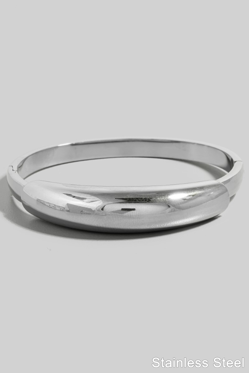 - This bangle bracelet features a fashionable stainless steel simple rounded hinge style. Explore a refined sense of style with this bangle bracelet, seamlessly elevating the chic factor of your look.