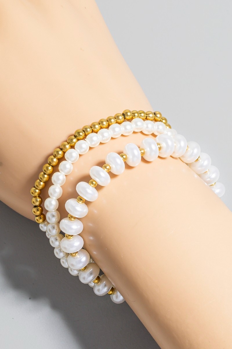 - This bracelet displays a fashionable stainless steel and pearl beaded set style. Savor the craftsmanship that goes beyond the ordinary, as this bracelet effortlessly captivates attention.