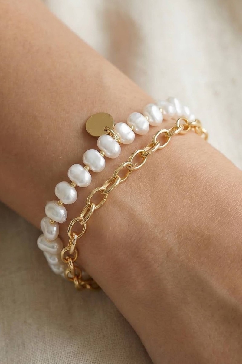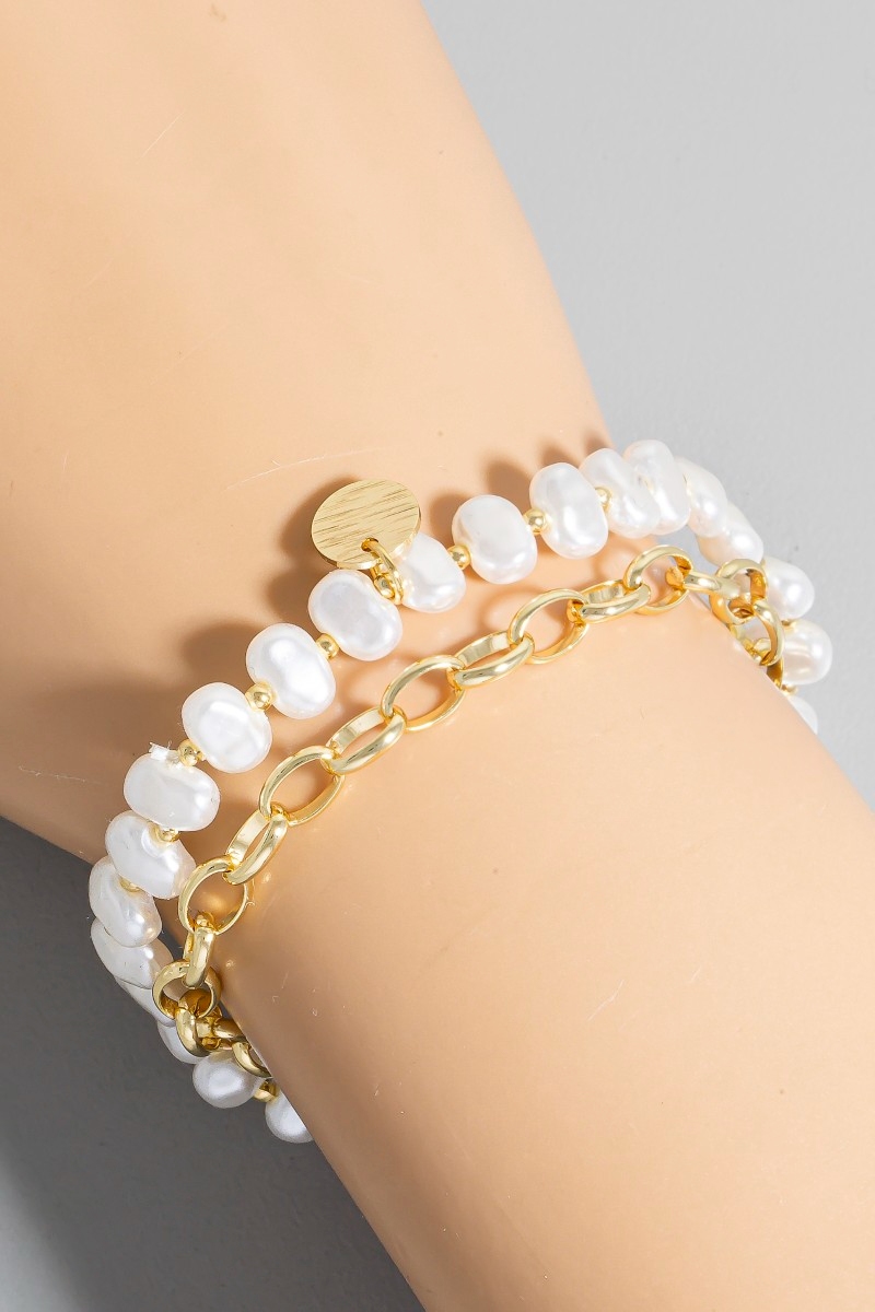 - This bracelet brings a stunning coin charm pearl beads and chain layered style. Unveil a new dimension of sophistication as this bracelet effortlessly enhances the elegance of your ensemble.