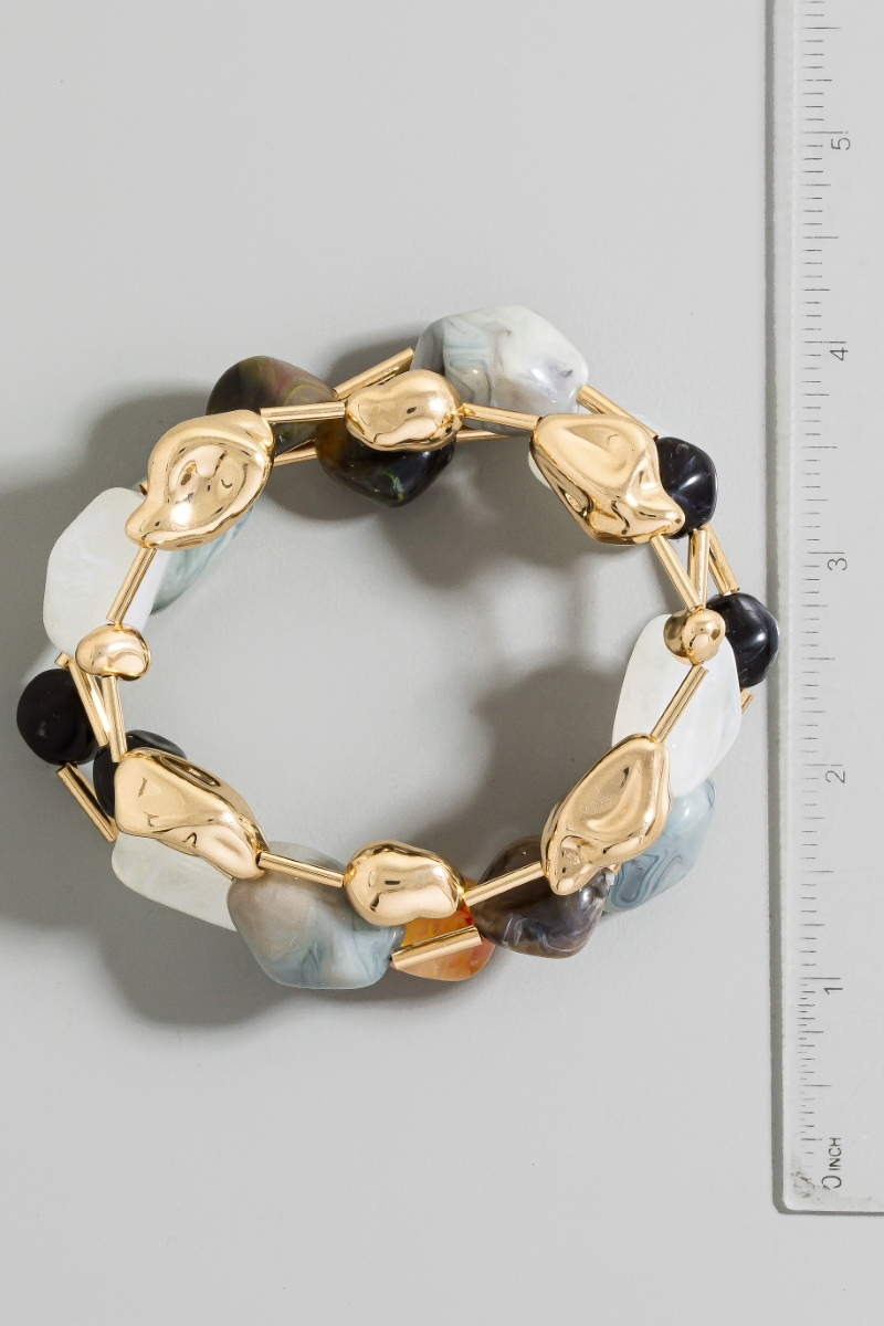 - This bracelet showcases a unique irregular metallic and acrylic beaded set style. Experience a burst of creativity in accessorizing as this piece effortlessly sets the tone for your unique style.