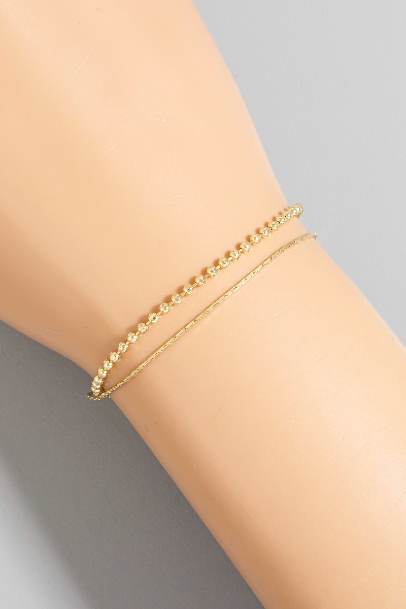 - This bracelet features a fashionable two row dainty metal chain bead style. Immerse yourself in the world of understated glamour as this bracelet effortlessly exudes timeless appeal.