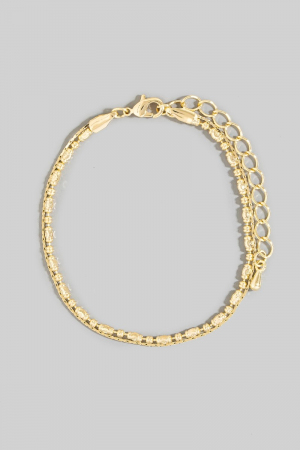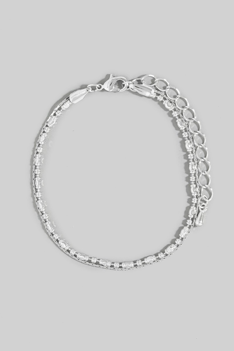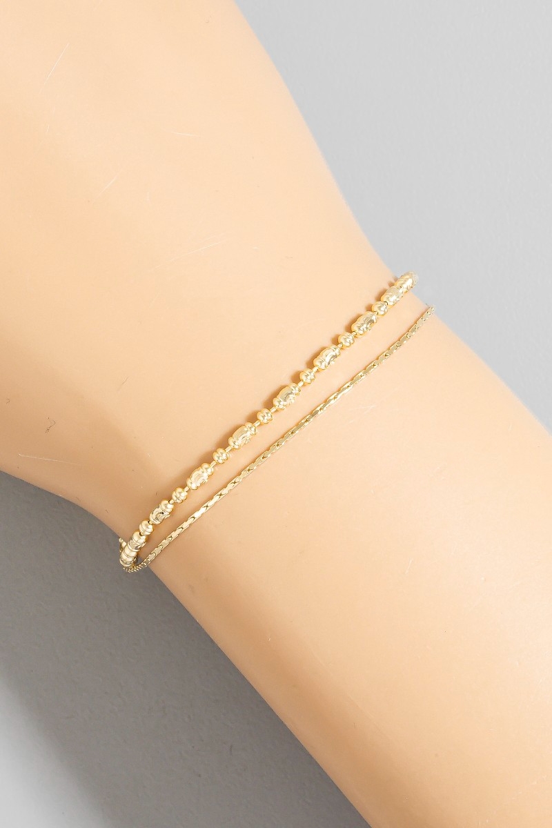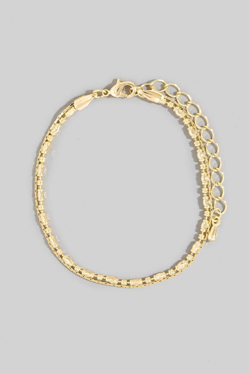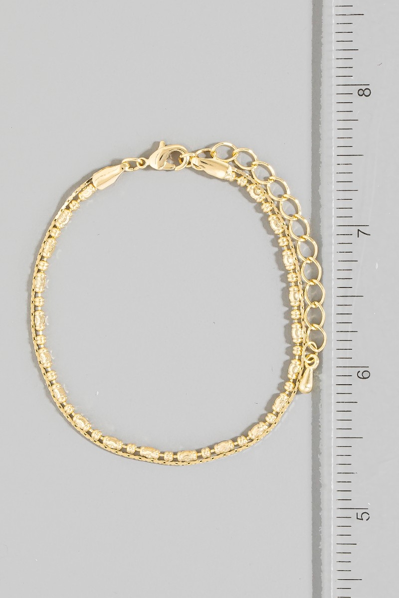 - This bracelet introduces a unique two row snake chain and metallic bead style. Indulge in the allure of exquisite craftsmanship as this bracelet effortlessly adds a touch of luxury to your attire.