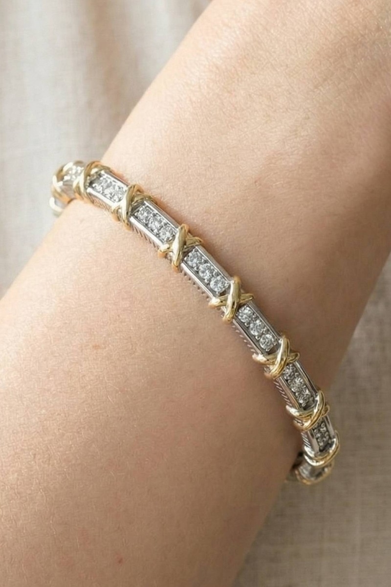 Two-Tone Cable Wire Cz X-Station Bangle Bracelet