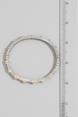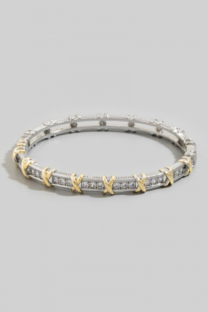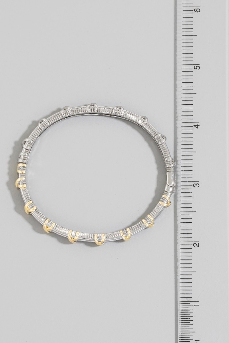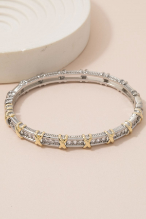 • This bangle bracelet brings a unique two-tone cubic zirconia x-bar style. Unveil modern elegance with this subtly intricate bangle bracelet.