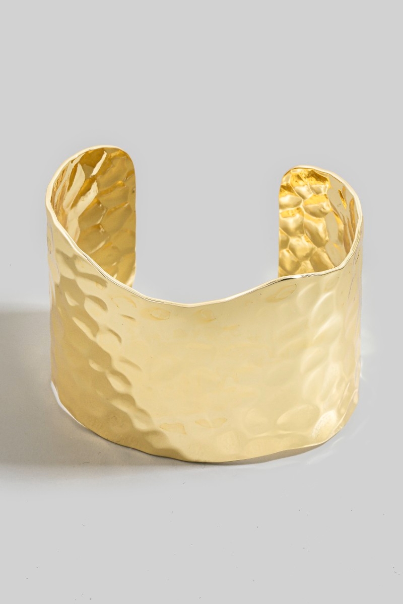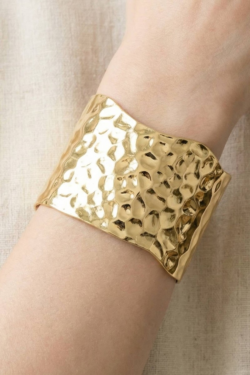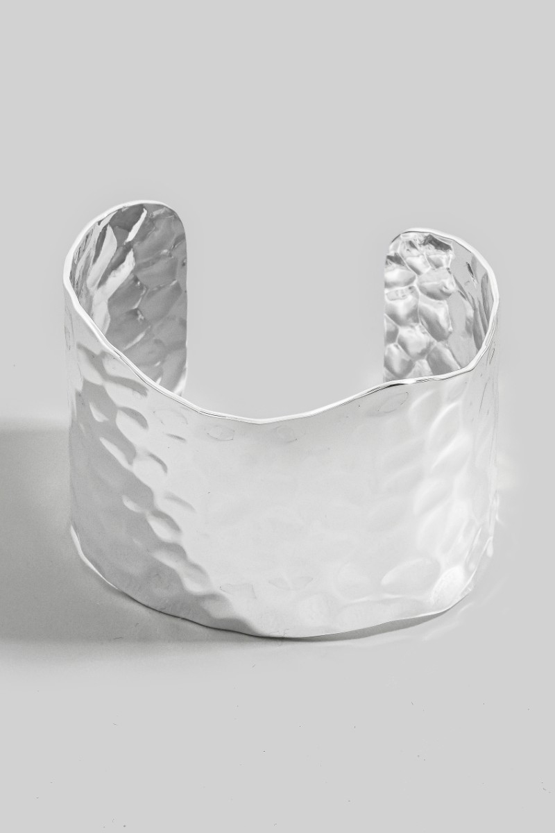 - This cuff bracelet features a fashionable wide hammered metallic style. Unveil modern elegance with this subtly intricate cuff bracelet.