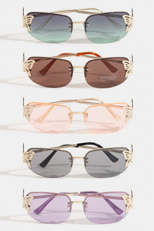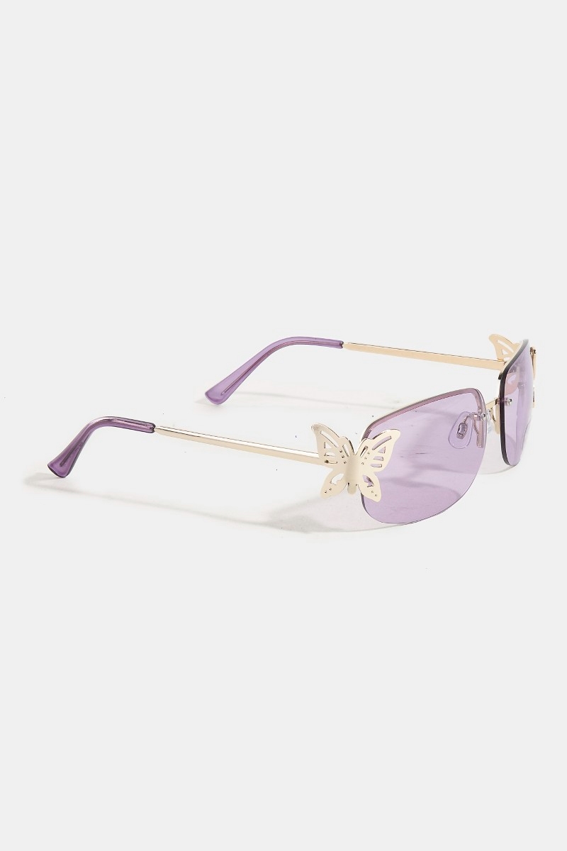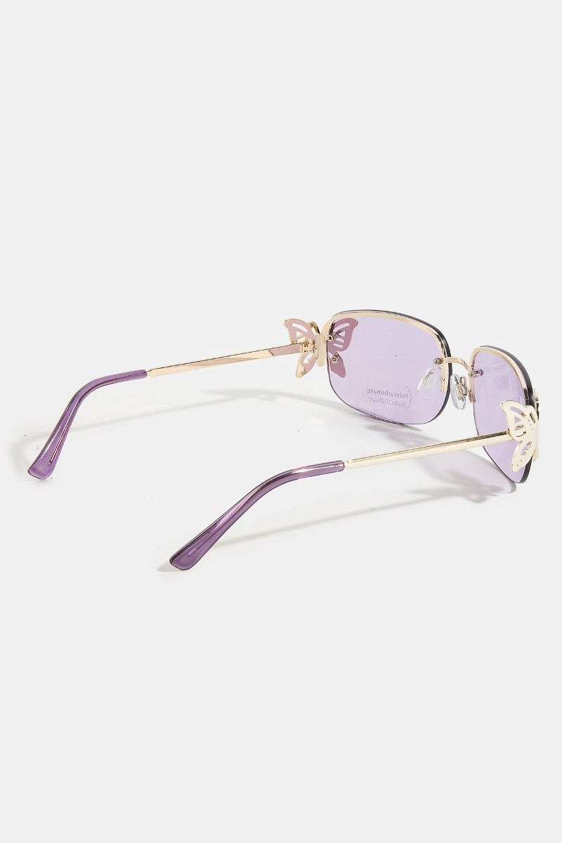 - This set of sunglasses adds a modern butterfly accent frameless rectangle sunglasses set style. Experience refined sophistication with this understated yet stylish piece.