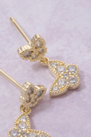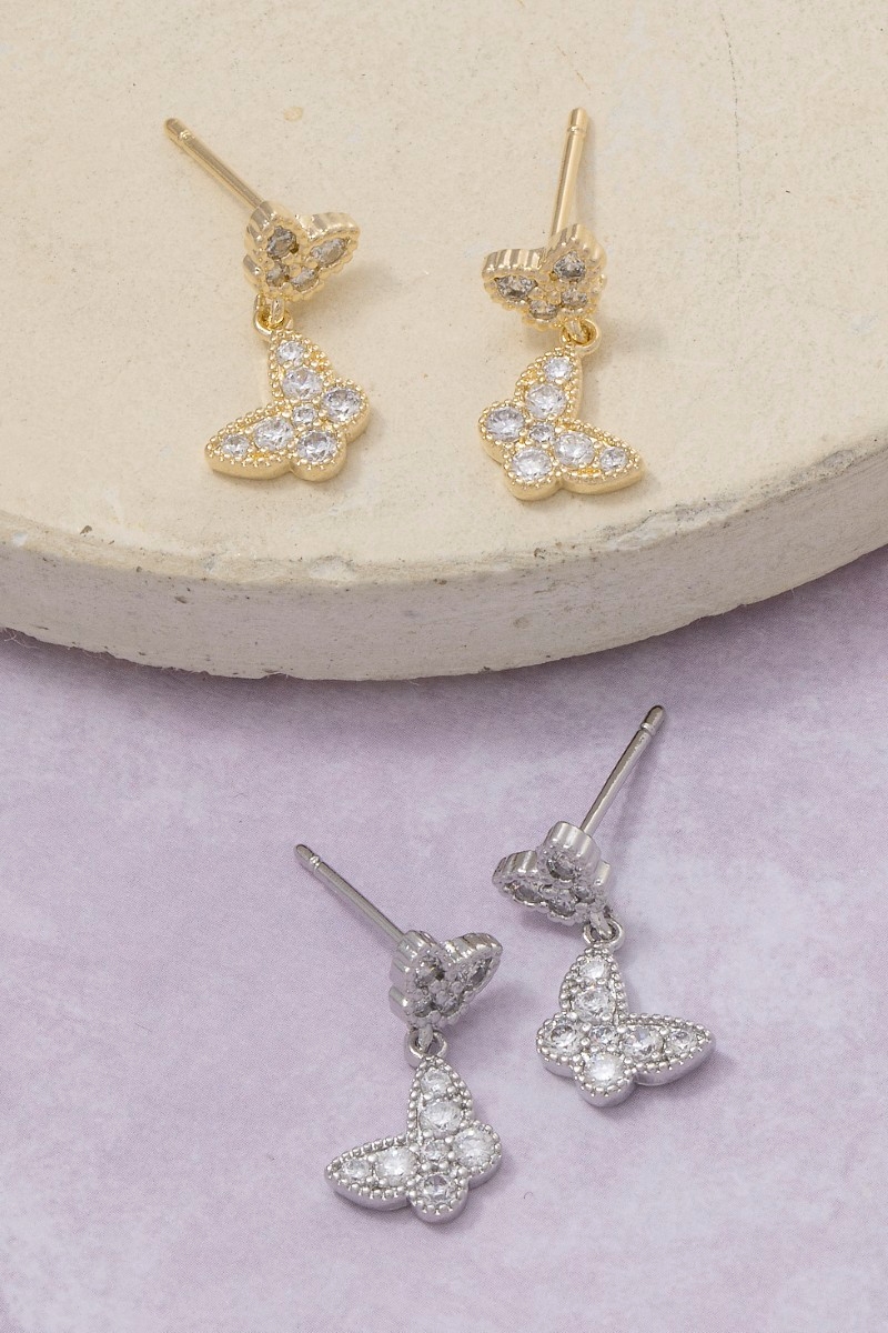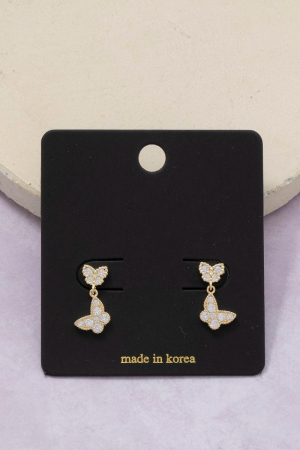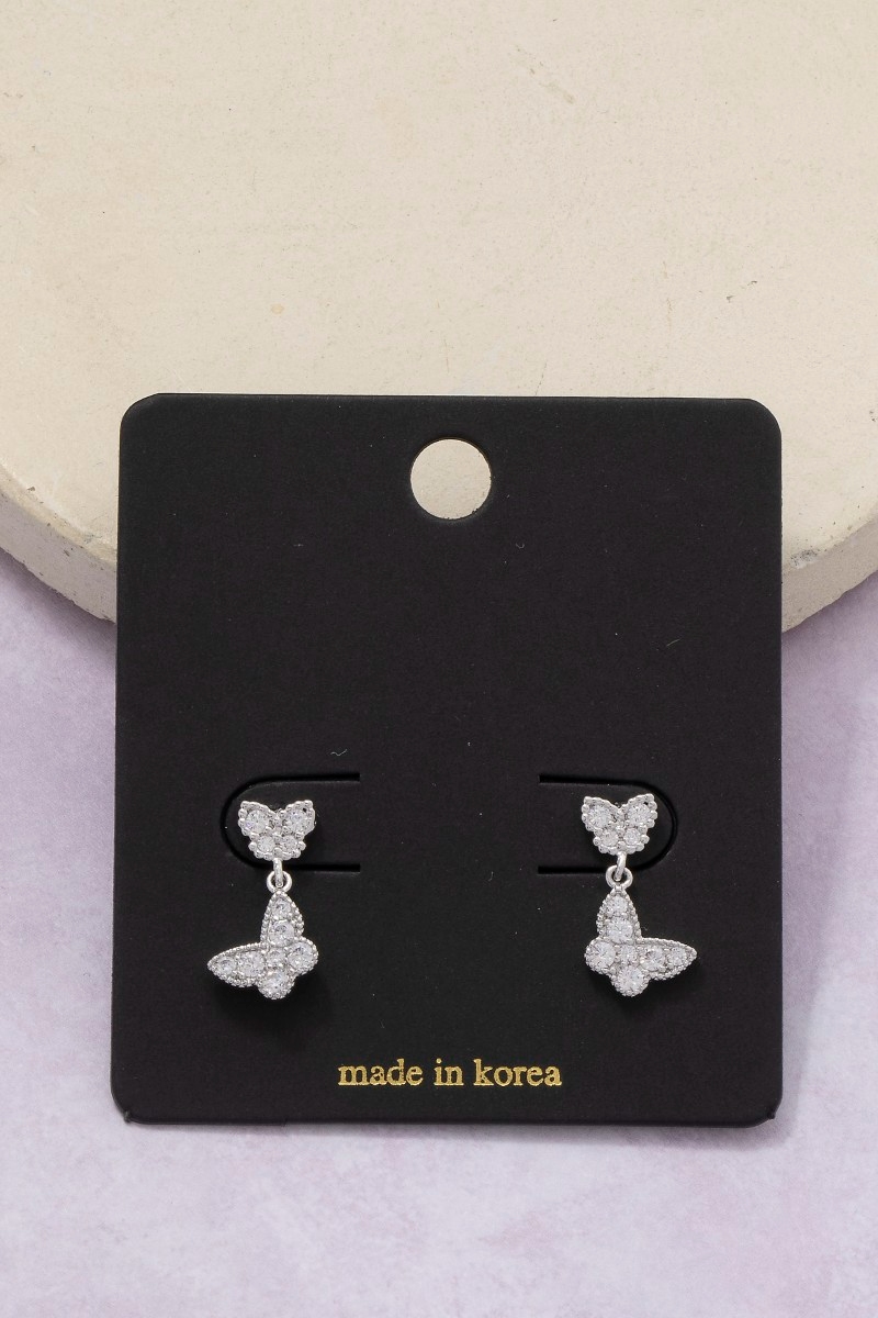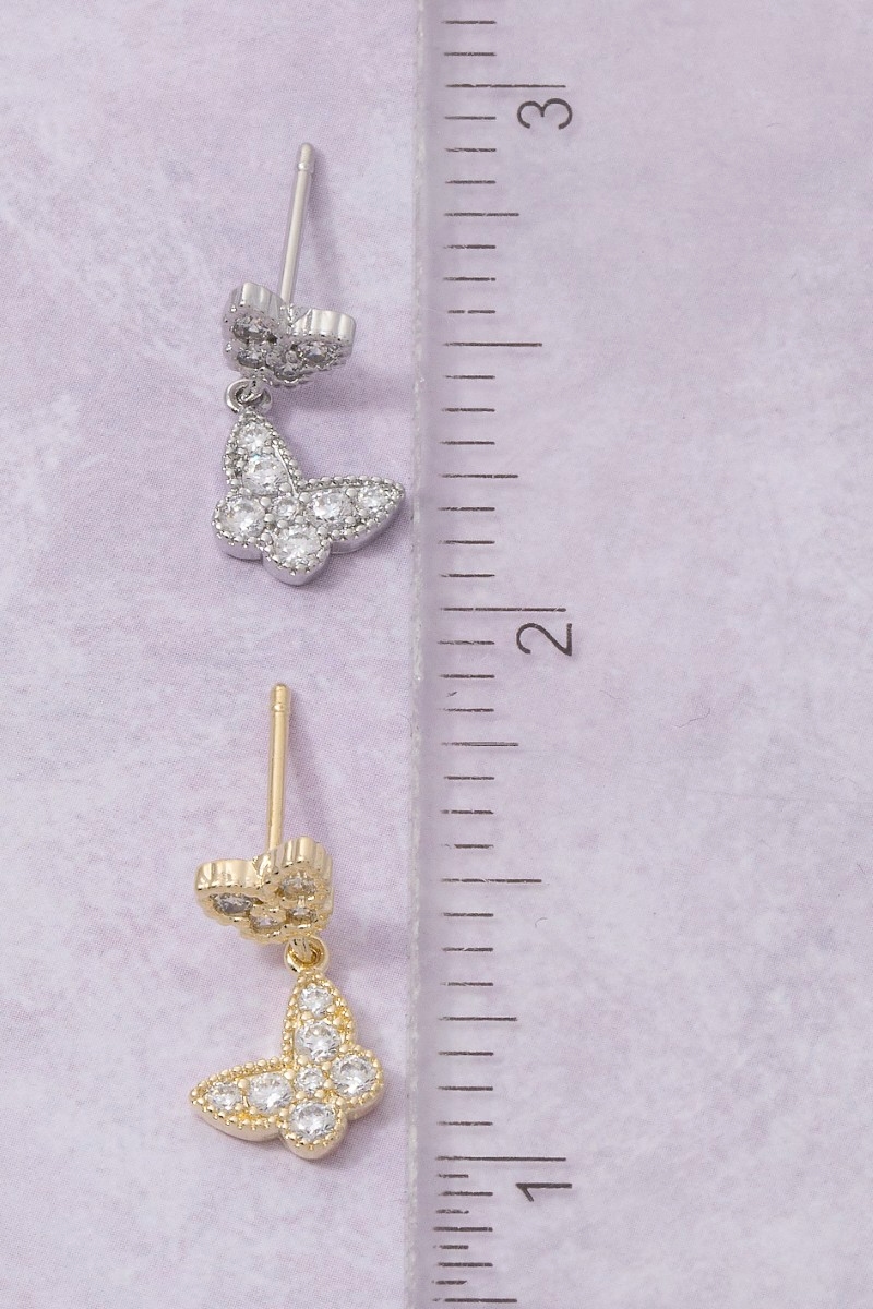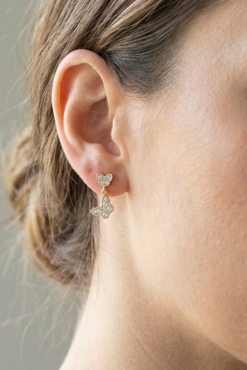 - This pair of dangle earrings adds a modern cz pave double butterfly stud style. Revel in the intricate design that effortlessly distinguishes this pair of dangle earrings, making it a statement piece.