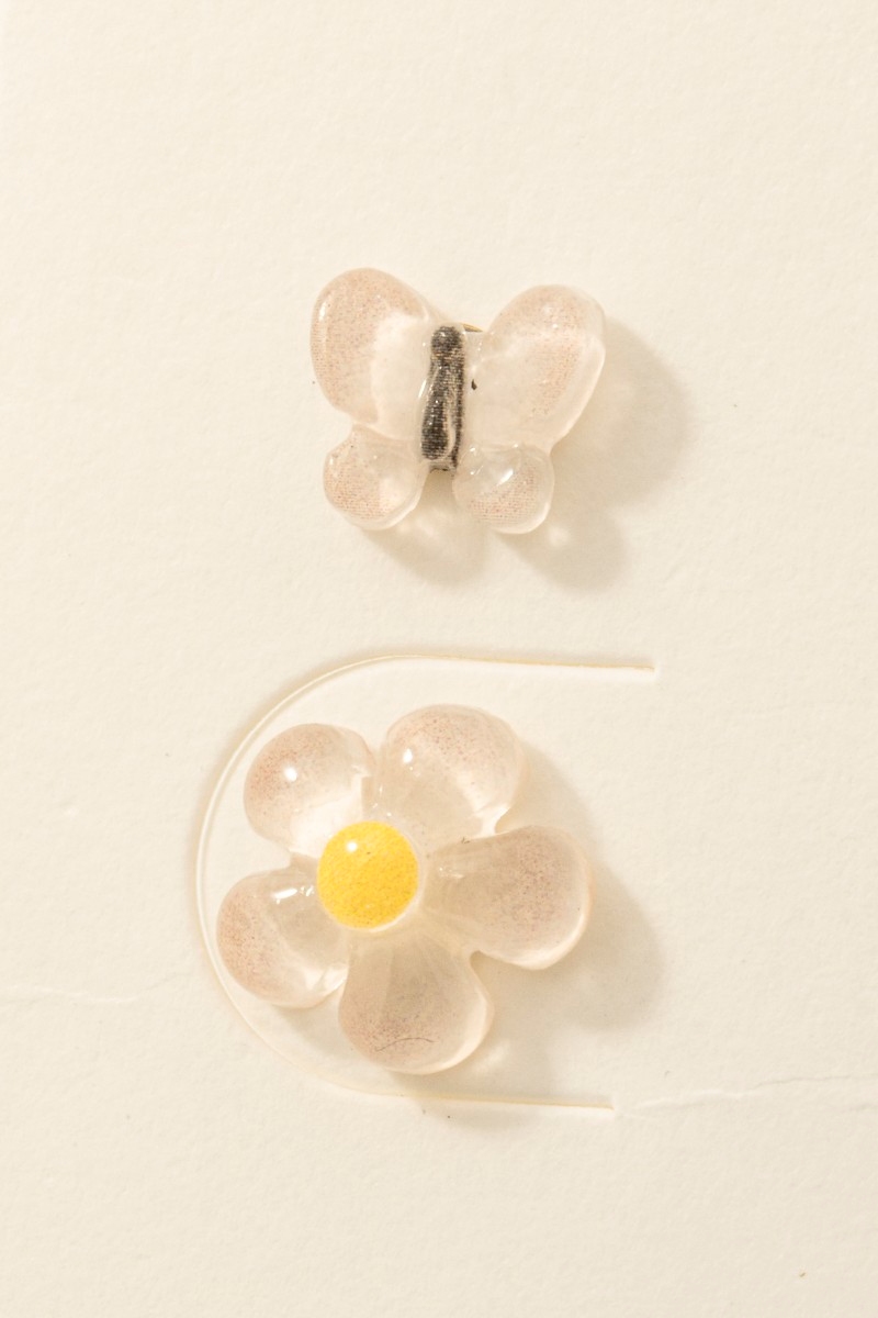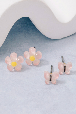 • This pair of stud earrings displays a vibrant clear acrylic pink flower and butterfly set style. Celebrate individual style with this versatile, eye-catching addition.