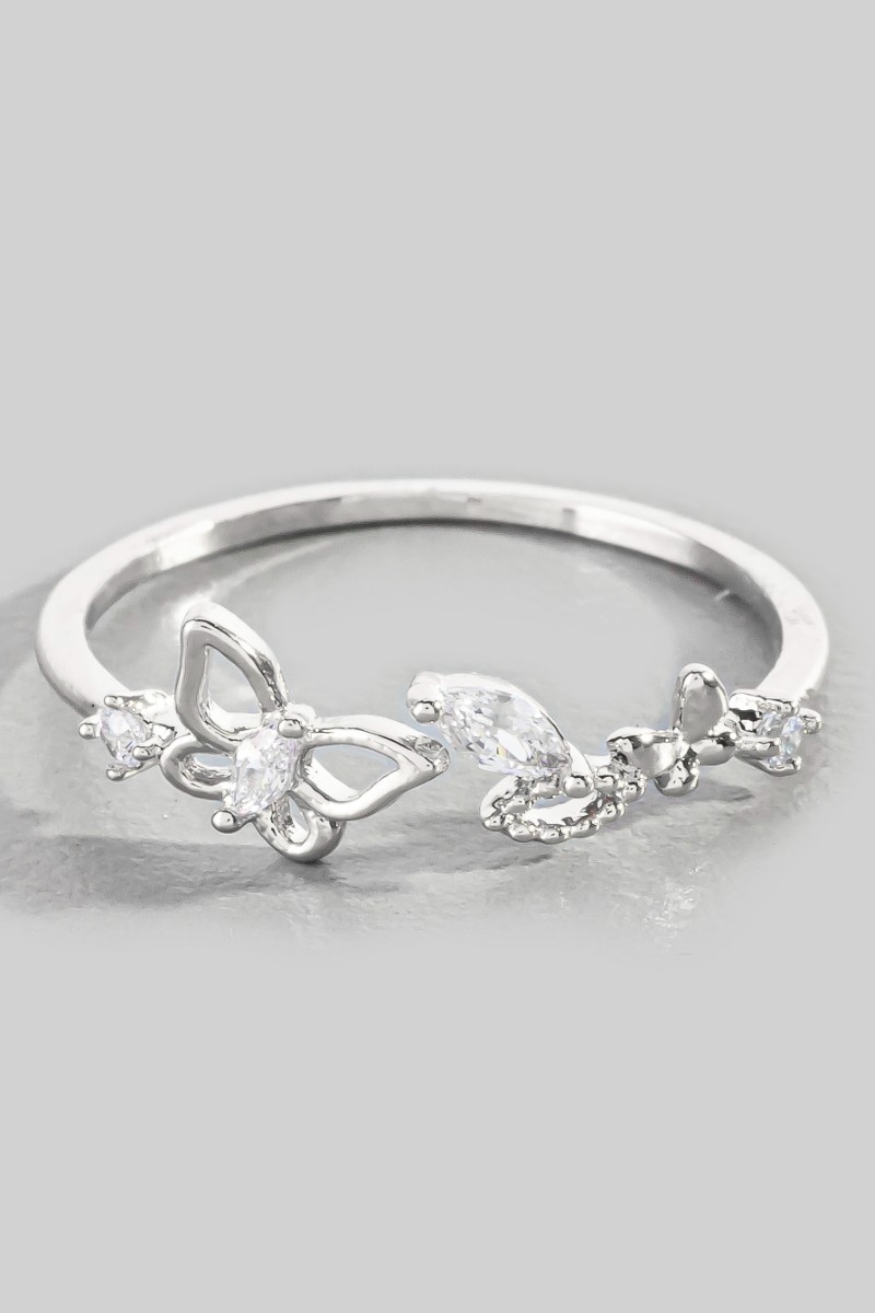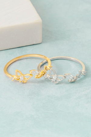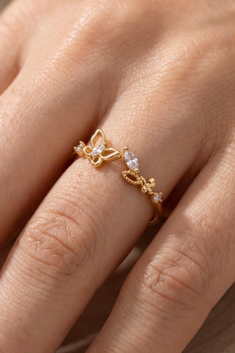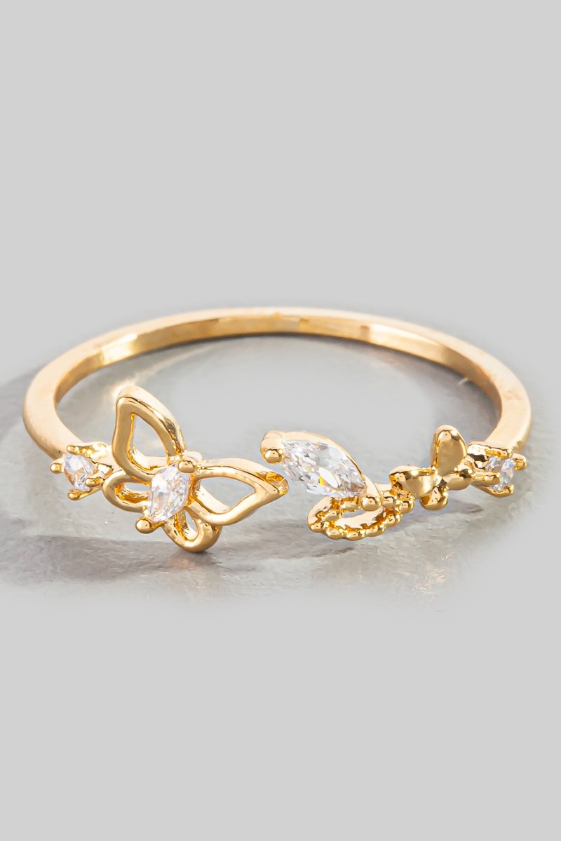 - This ring brings a stunning gold dipped cubic zirconia butterfly open style. Witness the perfect fusion of style and functionality as this ring effortlessly complements your lifestyle.