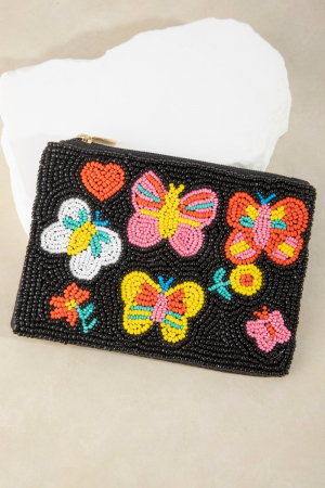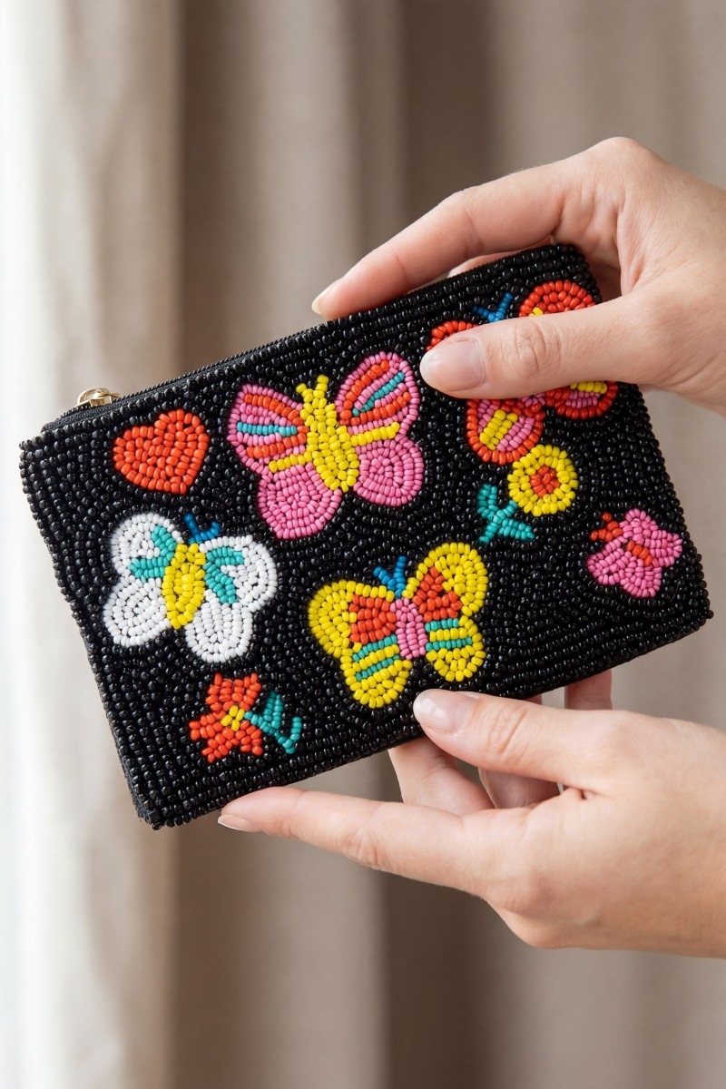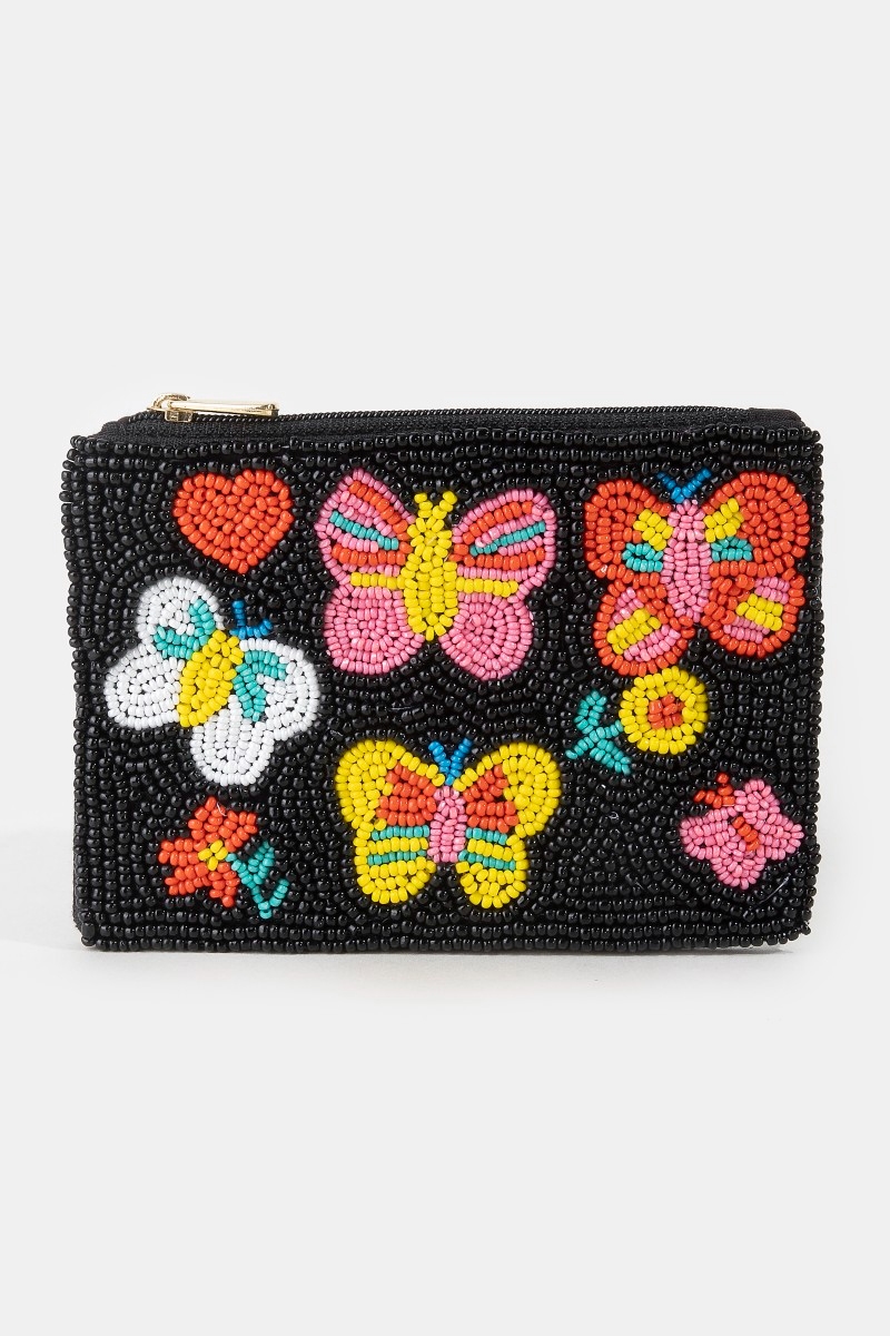 - This coin purse introduces a unique multi butterfly beaded style. Unveil a new dimension of sophistication as this coin purse effortlessly enhances the elegance of your ensemble.
