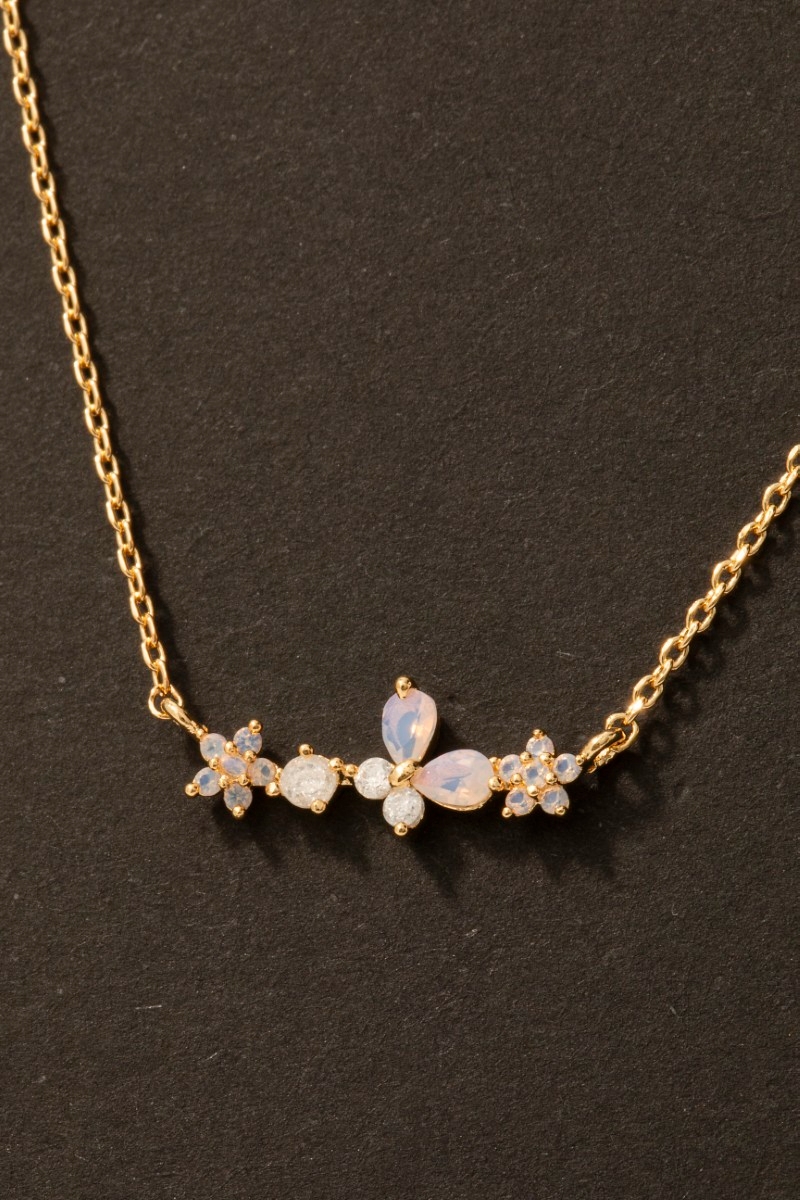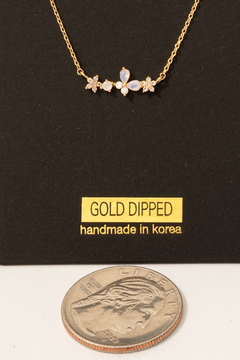 • This necklace brings a luxurious gold dipped cubic zirconia floral butterfly bar pendant style. Embark on a journey of sartorial refinement as this necklace effortlessly complements your fashion sense.