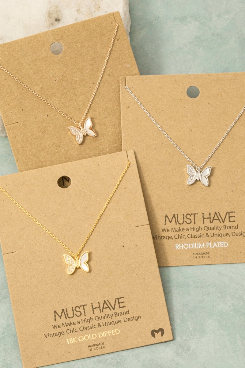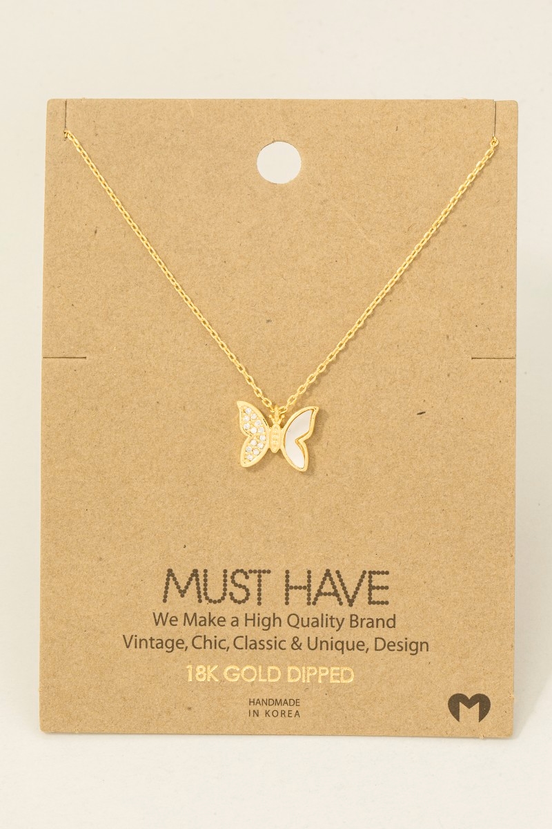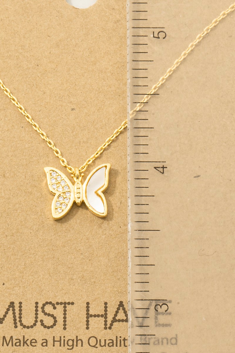 • This trending necklace introduces a unique gold dipped shell and cubic zirconia pave butterfly pendant necklace style. Celebrate individuality with this trending necklace that effortlessly expresses your unique sense of style.