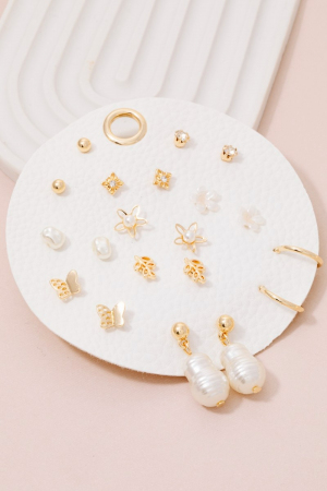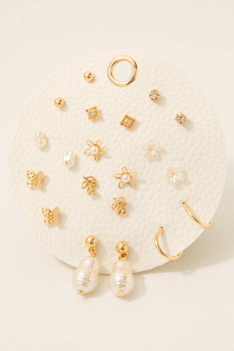 • This pair of stud earrings displays a fashionable pearl floral and butterfly 10 pair set style. Elevate your ensemble with this chic, timeless pair of stud earrings.