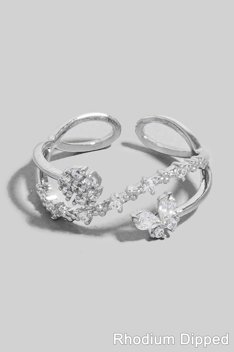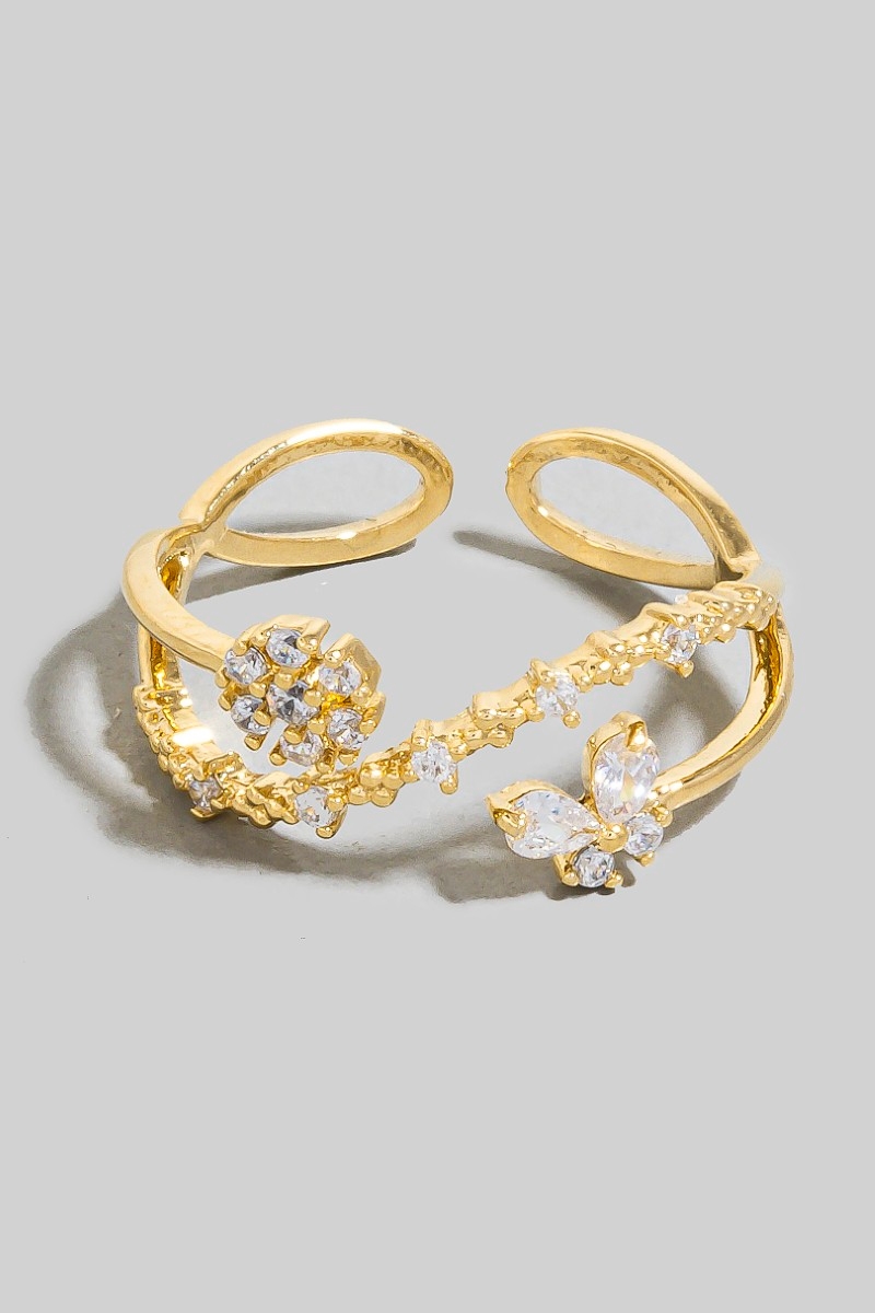 - This ring features a fashionable gold dipped butterfly and flower band style. Immerse yourself in the world of understated glamour as this ring effortlessly exudes timeless appeal.