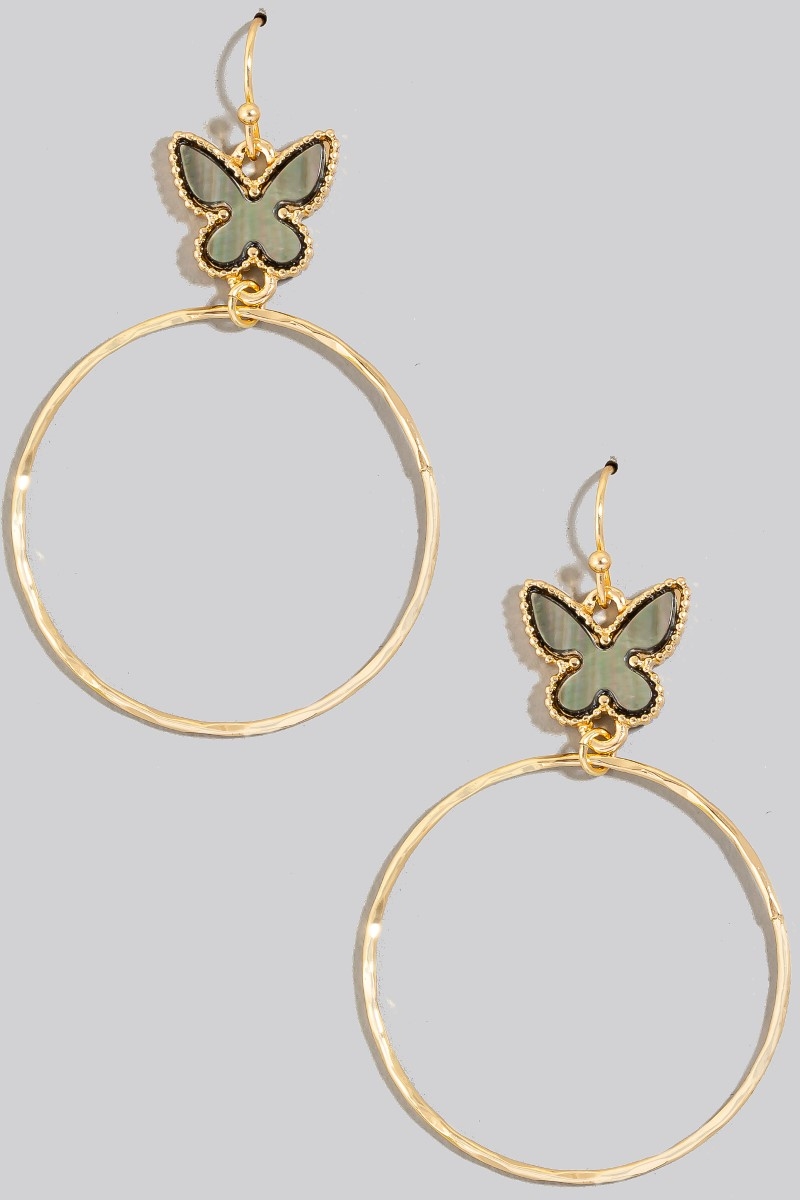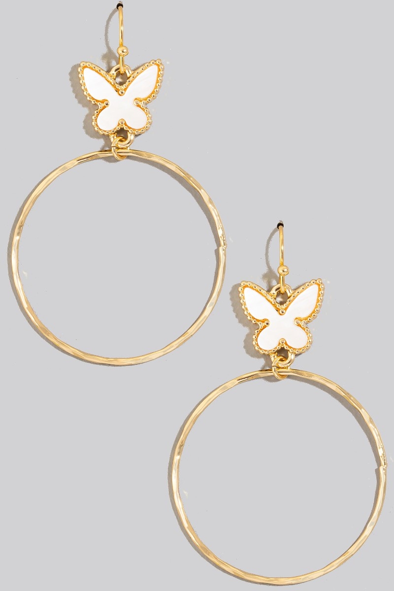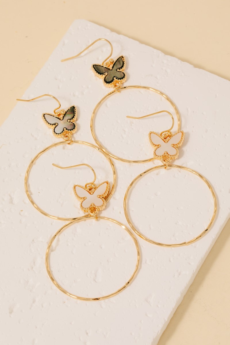 • This pair of dangle earrings brings a unique shell butterfly and hoop style. Immerse yourself in the details of design, as this pair of dangle earrings effortlessly becomes a conversation starter.