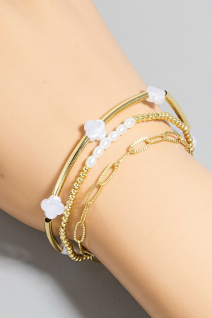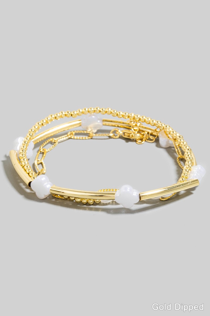 • this columbus jewelry bracelet adds a modern gold dipped pearl clover charms and beads layered style. Immerse yourself in the details of design, as this columbus jewelry bracelet effortlessly becomes a conversation starter.