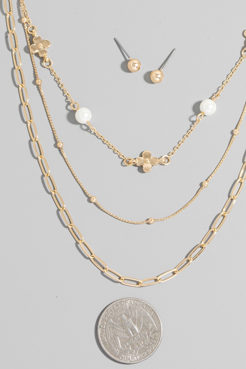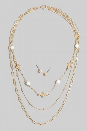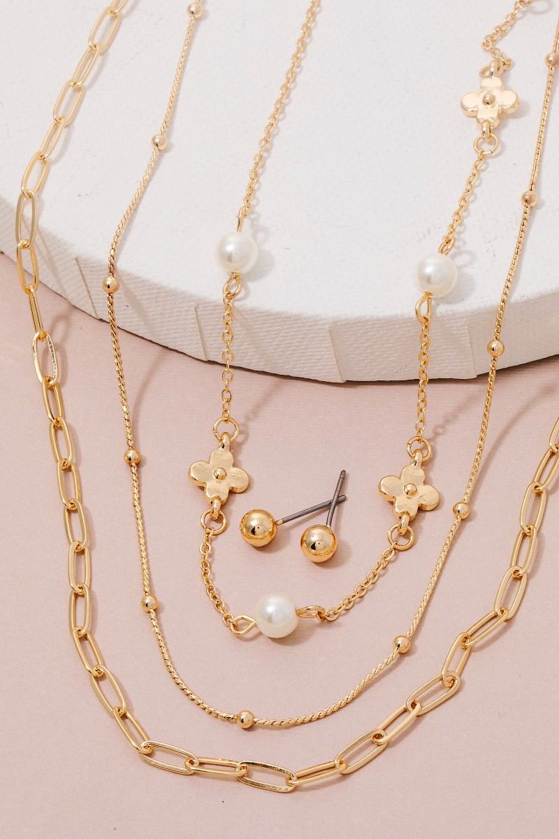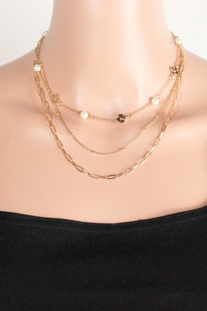 - This chain necklace displays a fashionable clover and pearl station charms layered set style. Experience a subtle blend of modernity and classic charm as this chain necklace effortlessly adorns your ensemble.
