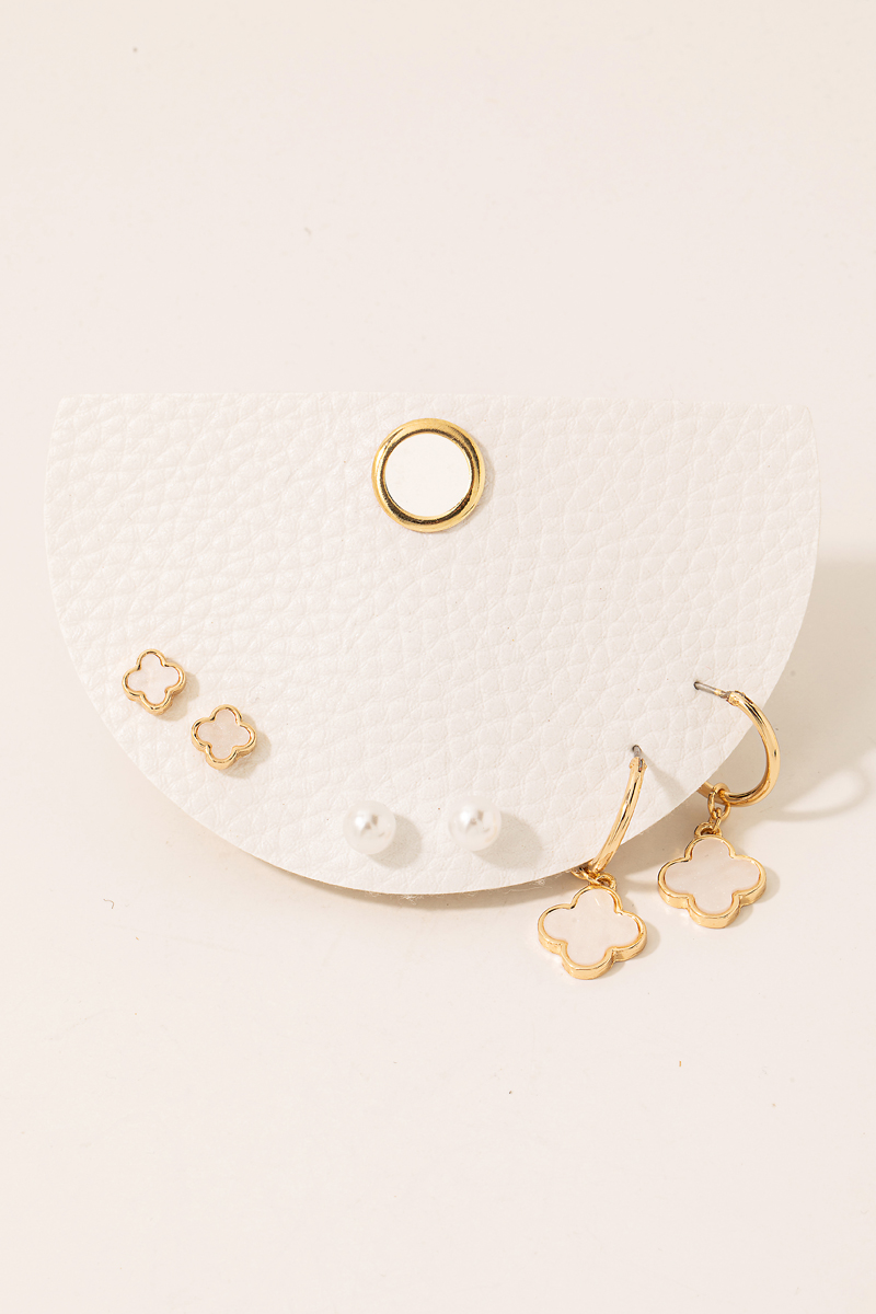 • This pair of earrings showcases a timeless 3pc pearl and clovers mixed set style. Discover the perfect balance of subtlety and flair as this pair of earrings effortlessly completes your look.