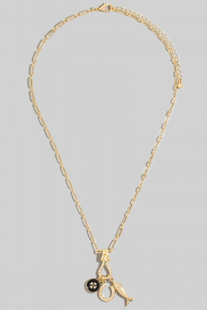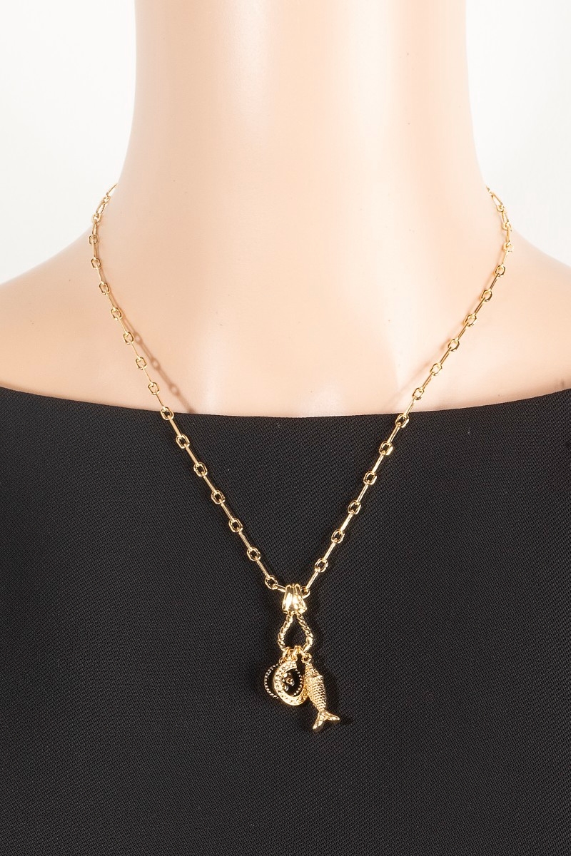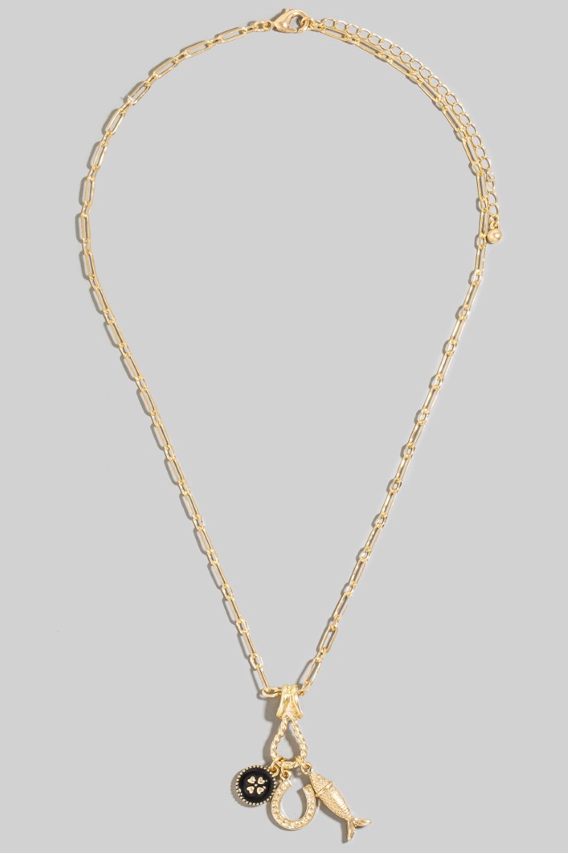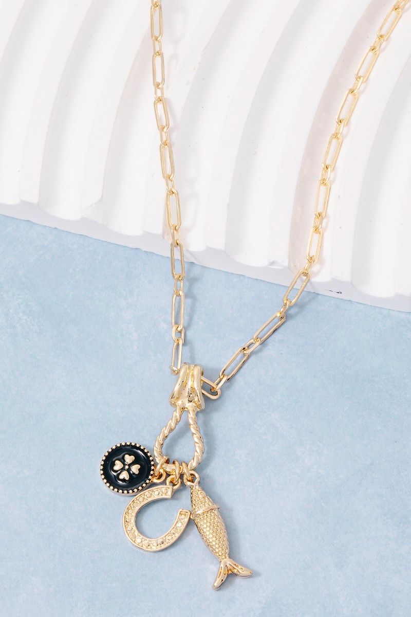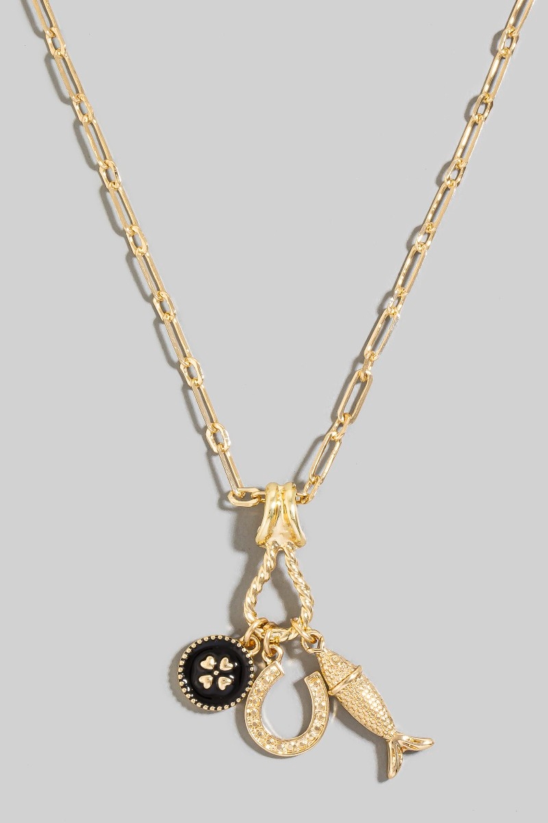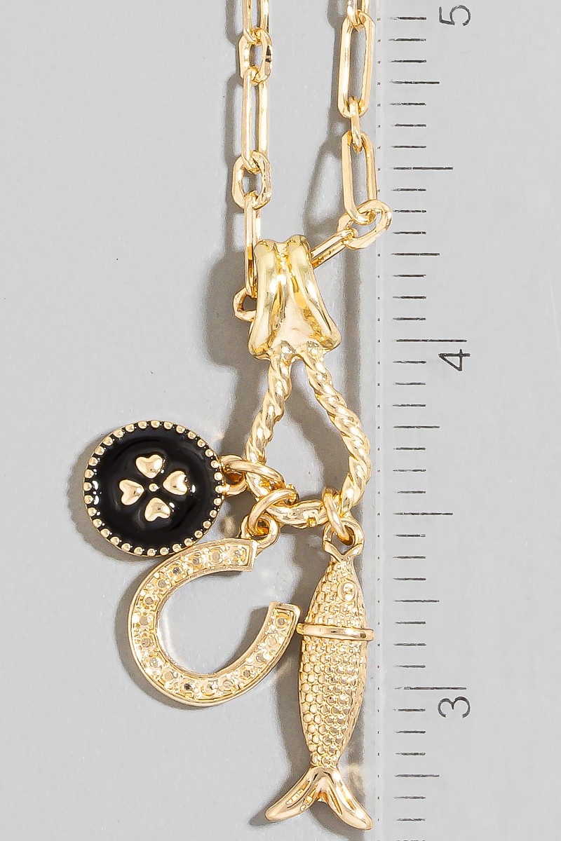 - This necklace brings a stunning fish clover and horse shoe charms style. Experience refined sophistication with this understated yet stylish piece.