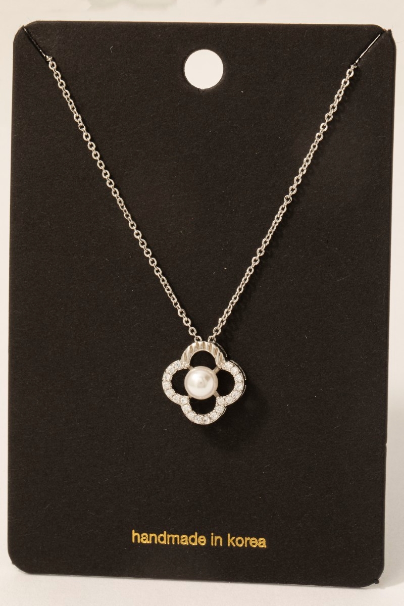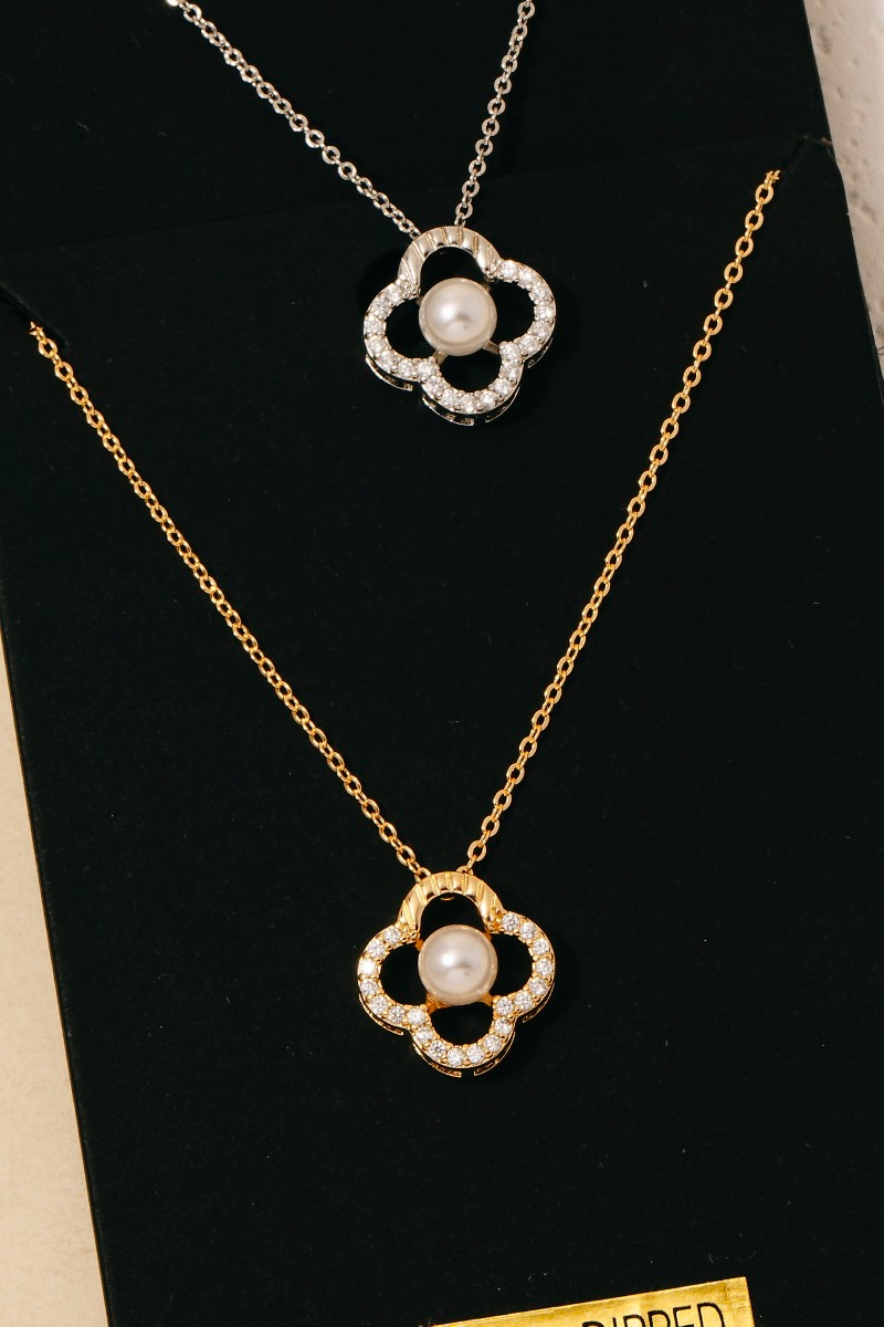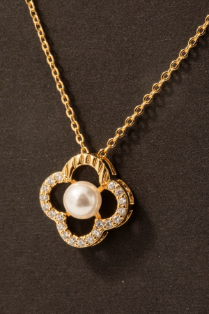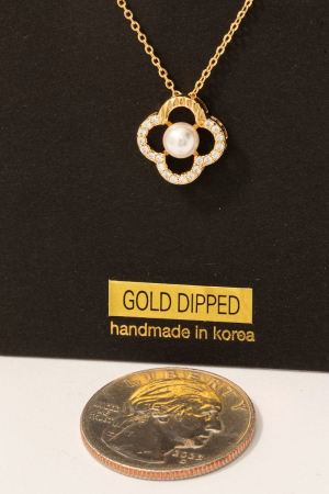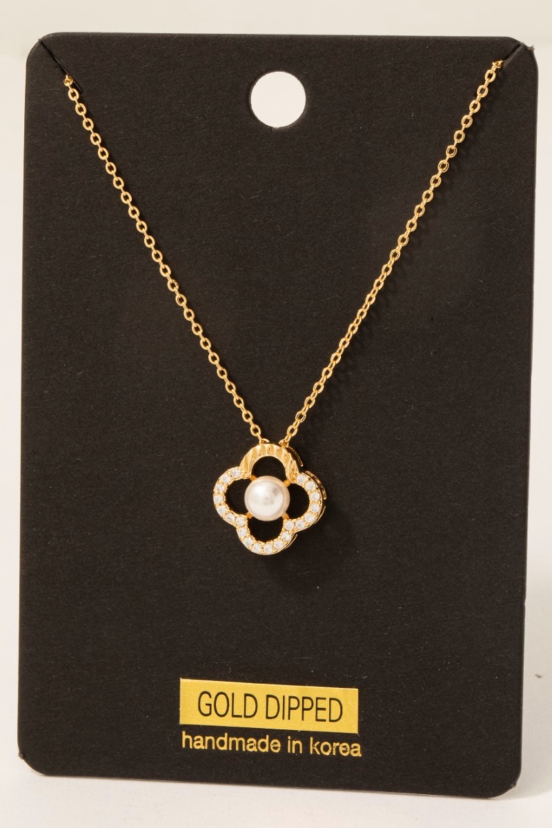 - This necklace features a fashionable gold dipped cubic zirconia set pearl clover pendant style. Indulge in the artistry of accessorizing with this unique piece.