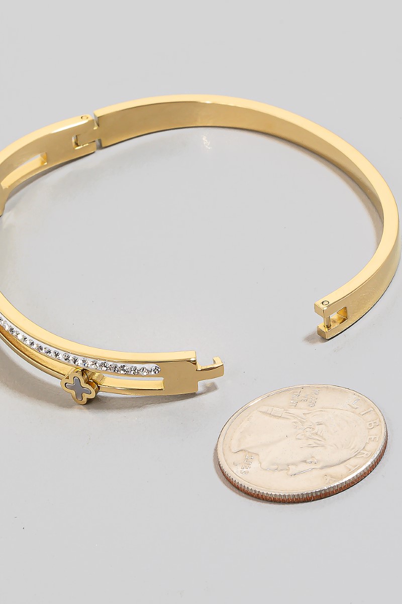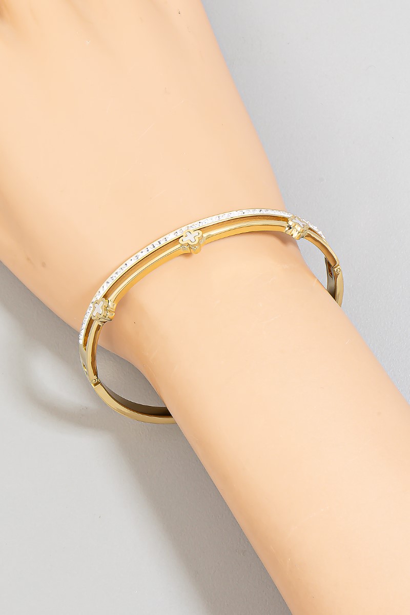 Gold Dipped Cz Mother Of Pearl Clover Hinge Bangle Bracelet