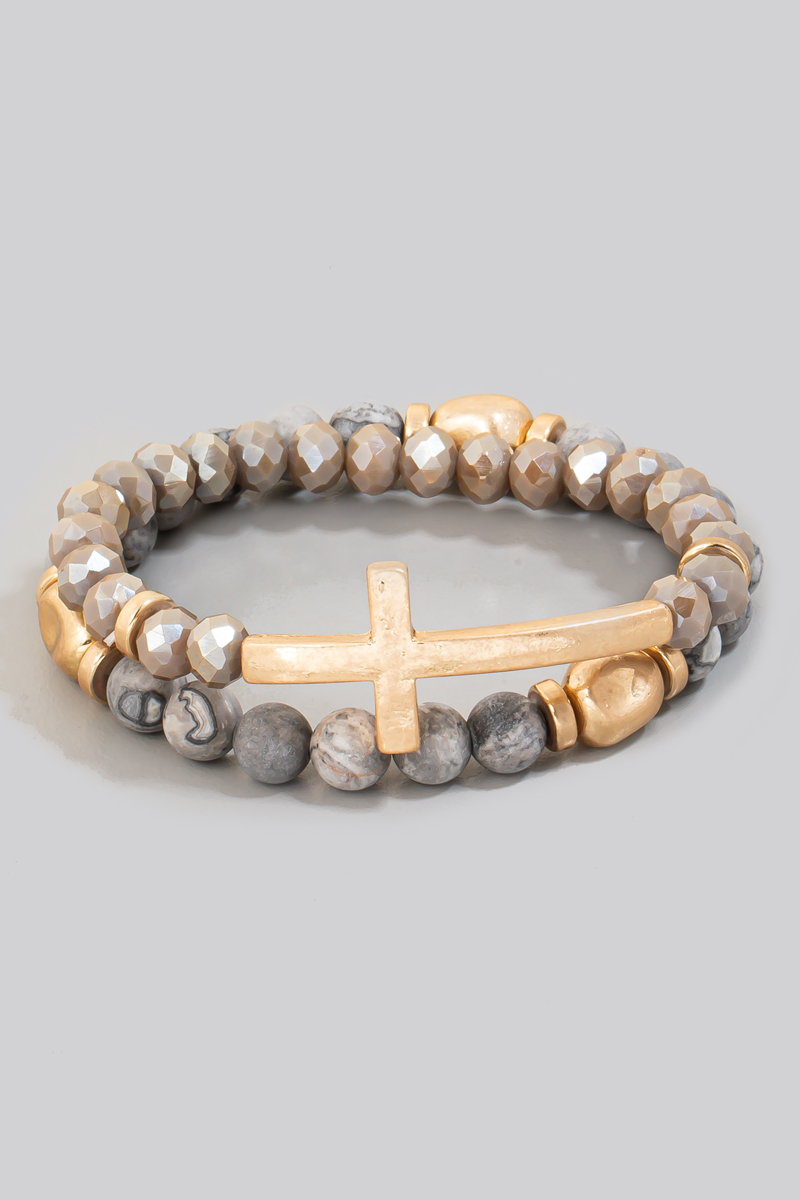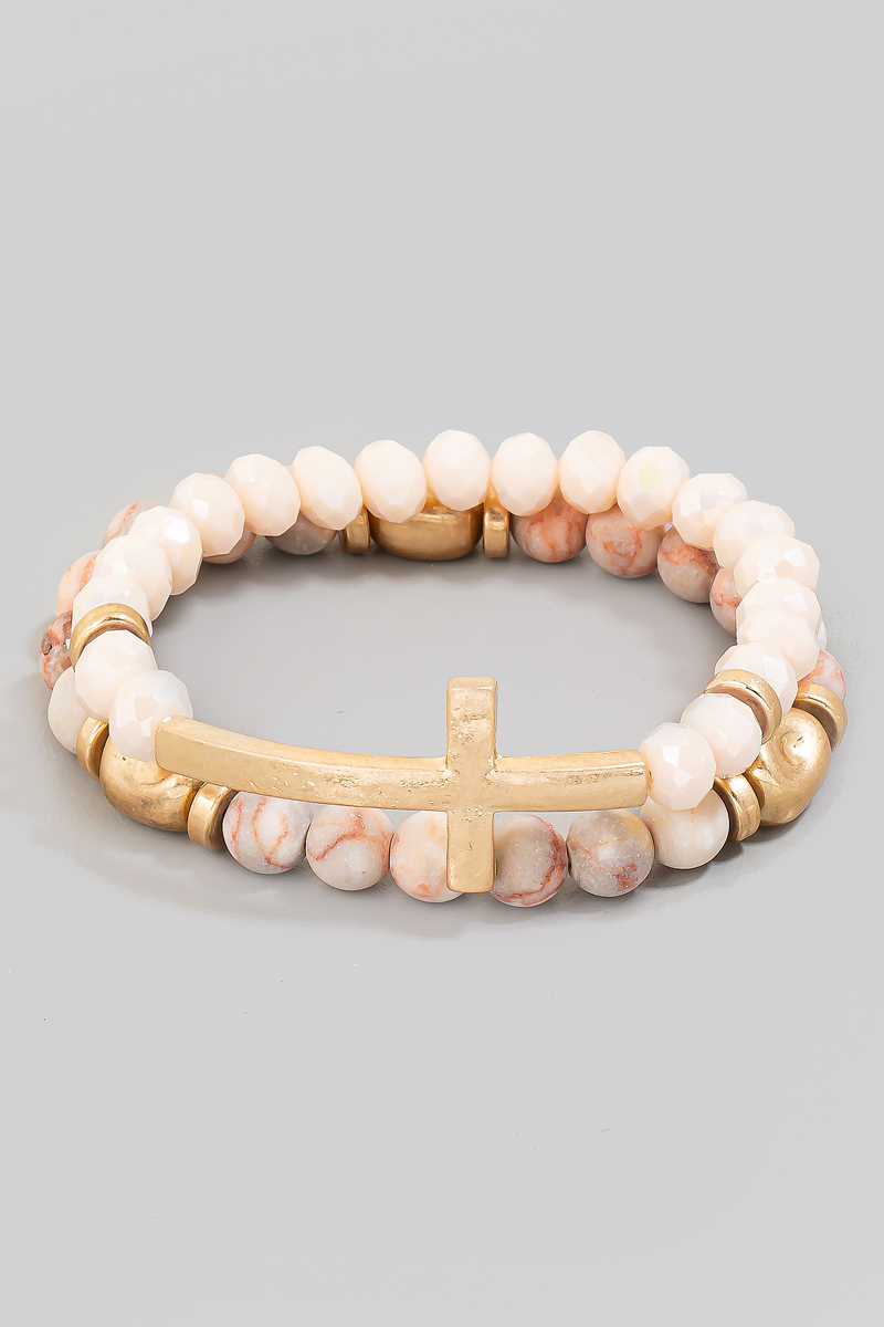 - This bracelet brings a stunning cross charm stone beaded set style. Indulge in the artistry of accessorizing with this unique piece.