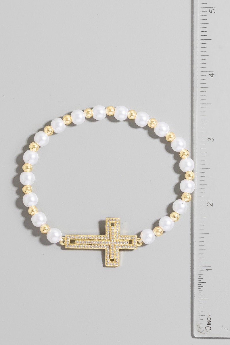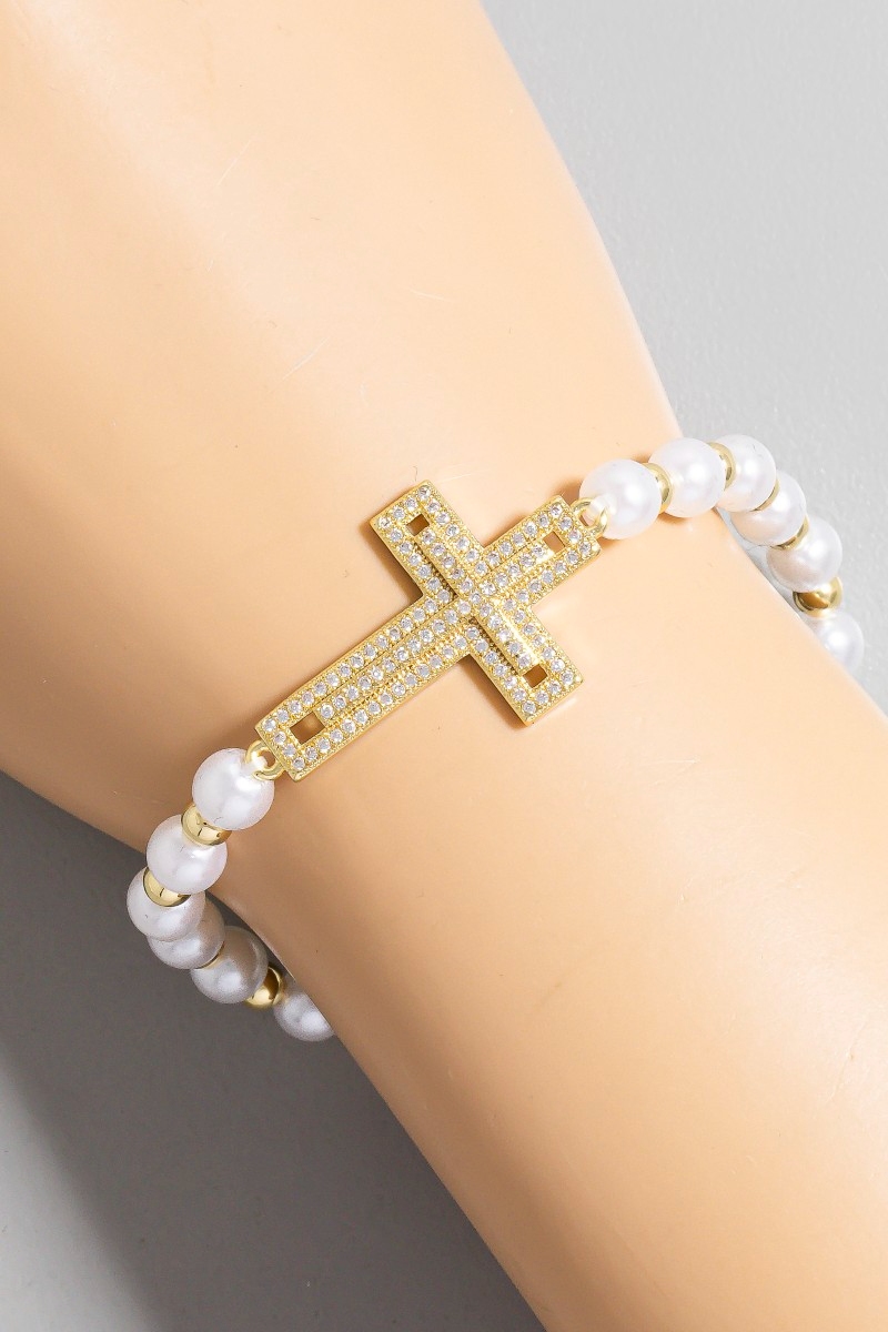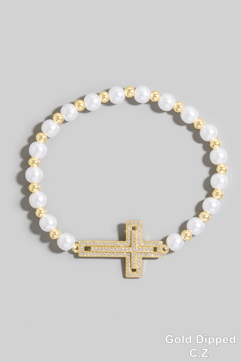 - This bracelet features a fashionable gold dipped cubic zirconia cross pearl beads style. Experience a burst of creativity in accessorizing as this piece effortlessly sets the tone for your unique style.