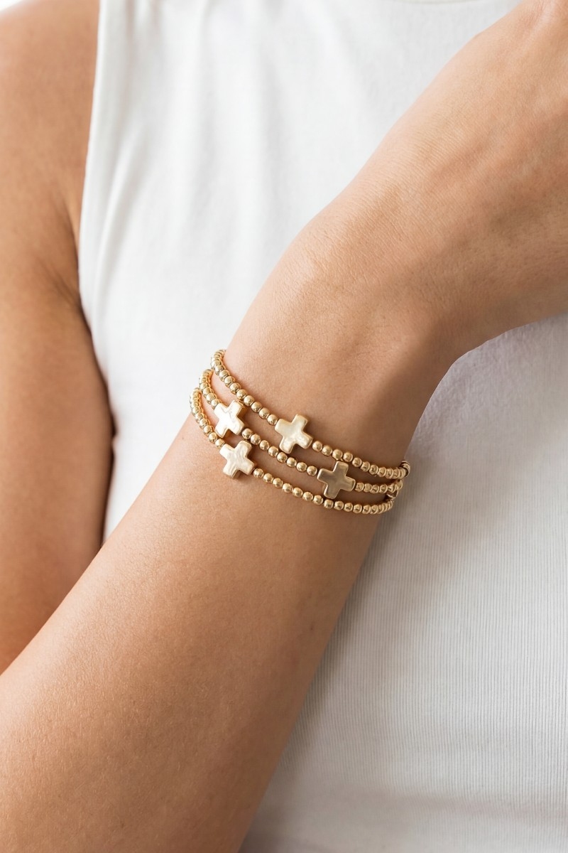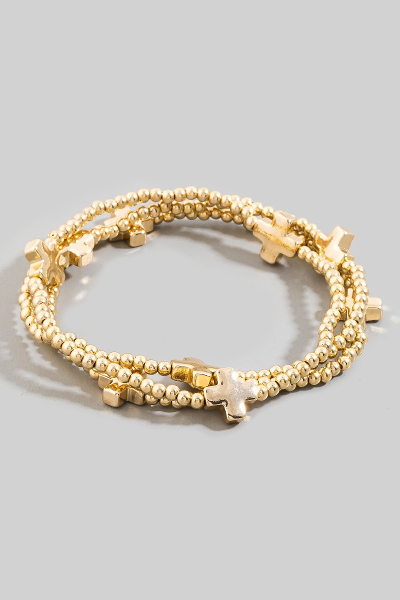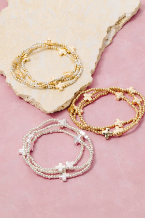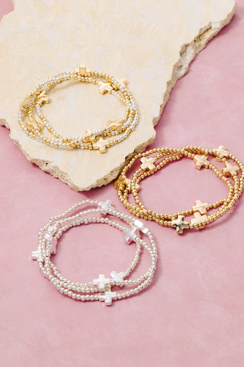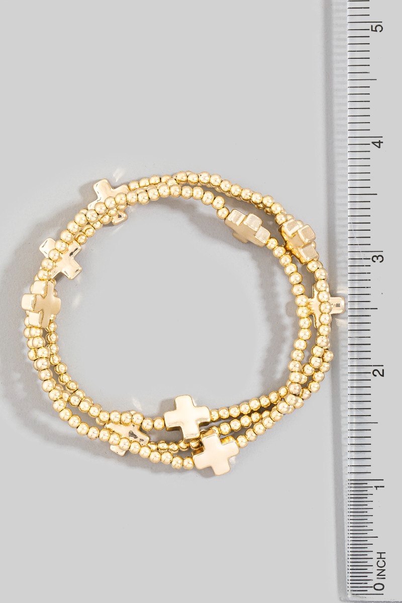 Hammered Cross Charm Metallic Beaded Bracelet Set