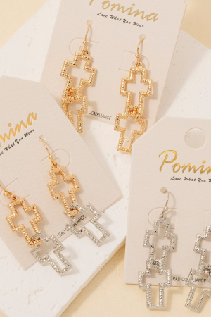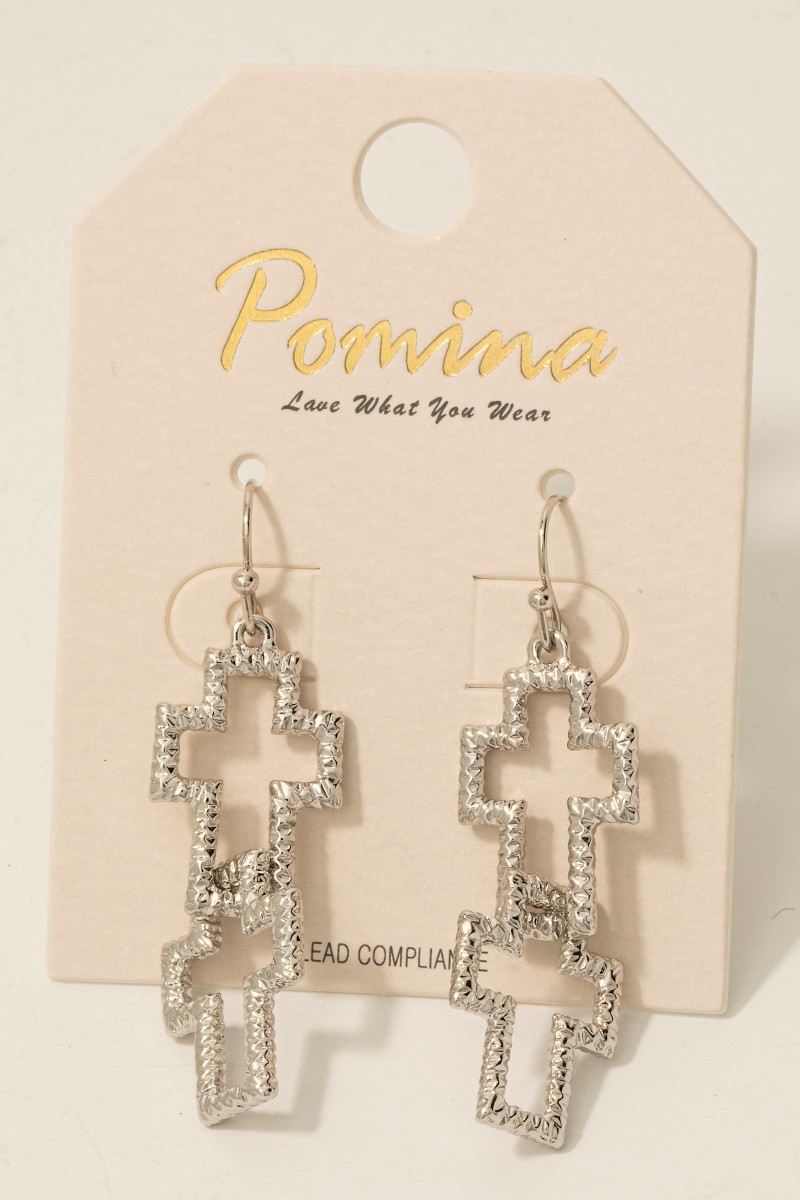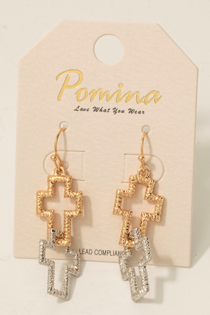 - This pair of earrings adds a modern double textured cross dangle hook style. Experience a subtle blend of modernity and classic charm as this pair of earrings effortlessly adorns your ensemble.