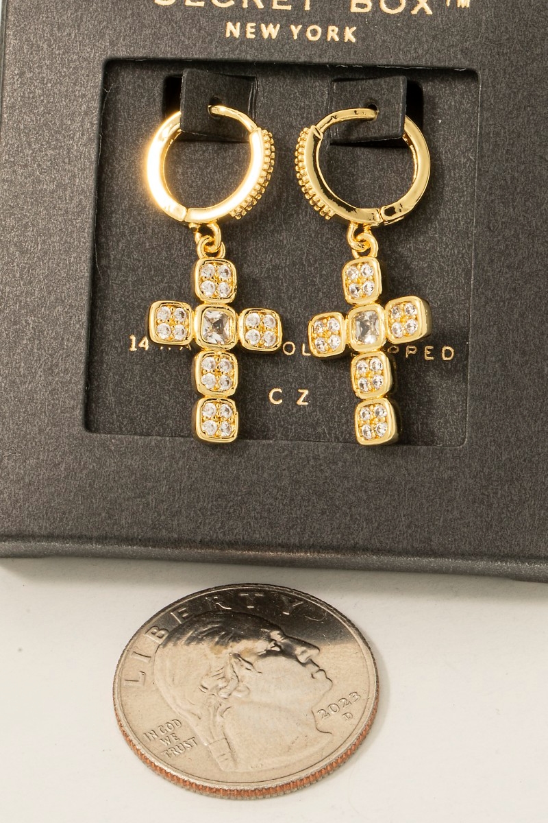 • This pair of hoop earrings brings a luxurious secret box gold dipped cubic zirconia cross charm style. Delight in the nuanced details that make this pair of hoop earrings a testament to fine design and impeccable taste.