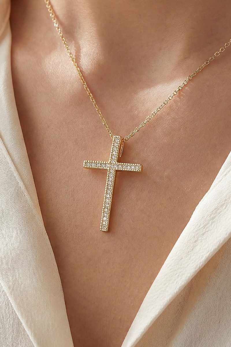 - This pendant necklace adds a modern gold dipped cubic zirconia pave cross style. Experience a subtle blend of modernity and classic charm as this pendant necklace effortlessly adorns your ensemble.