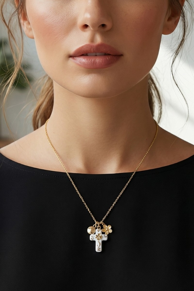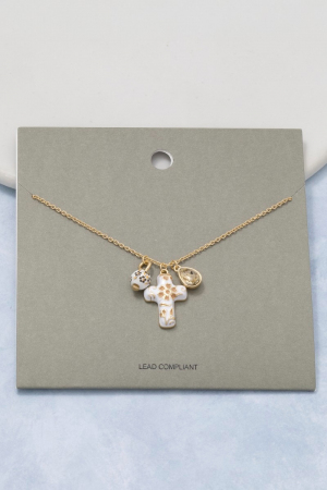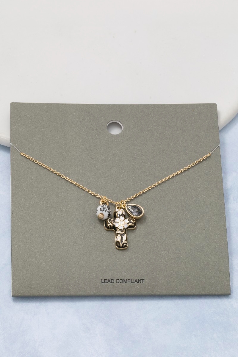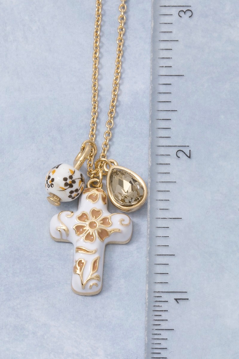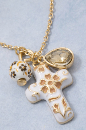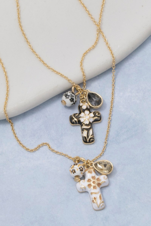 • This chain necklace displays a vibrant ceramic floral cross and bead charms style. Indulge in the artistry of accessorizing with this unique piece.