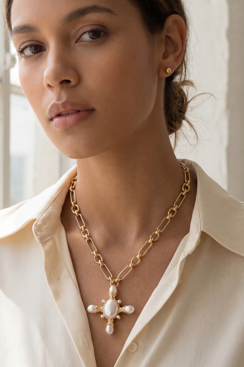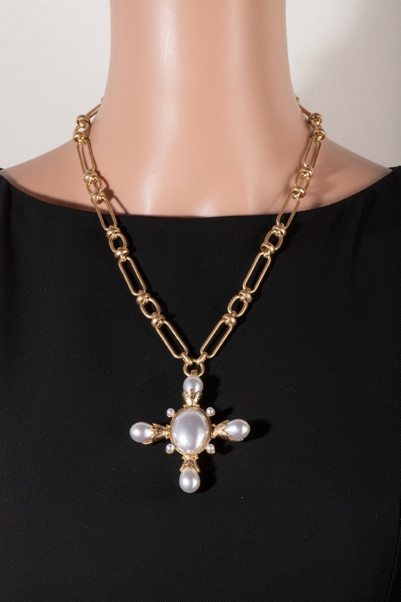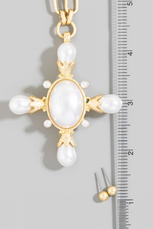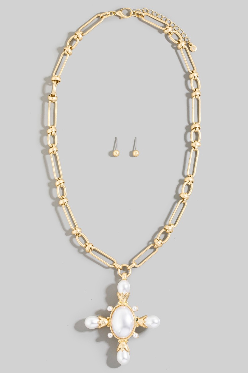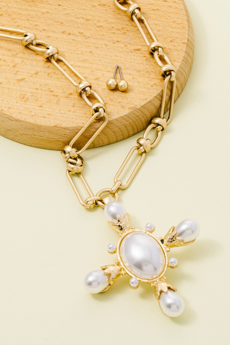 • This necklace set displays a fashionable chain link pearl cross pendant style. Celebrate individual style with this versatile, eye-catching addition.