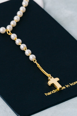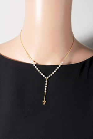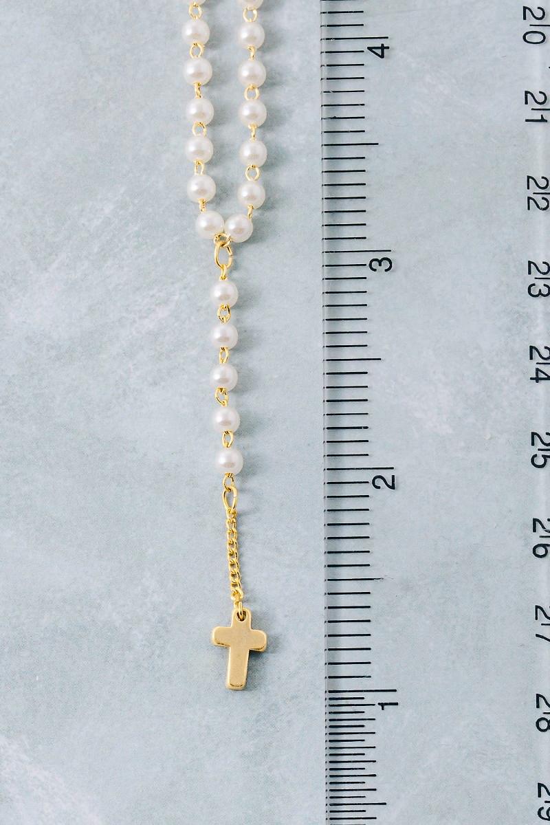 • This pendant necklace features a fashionable pearl beaded y chain cross style. Experience a burst of creativity in accessorizing as this piece effortlessly sets the tone for your unique style.