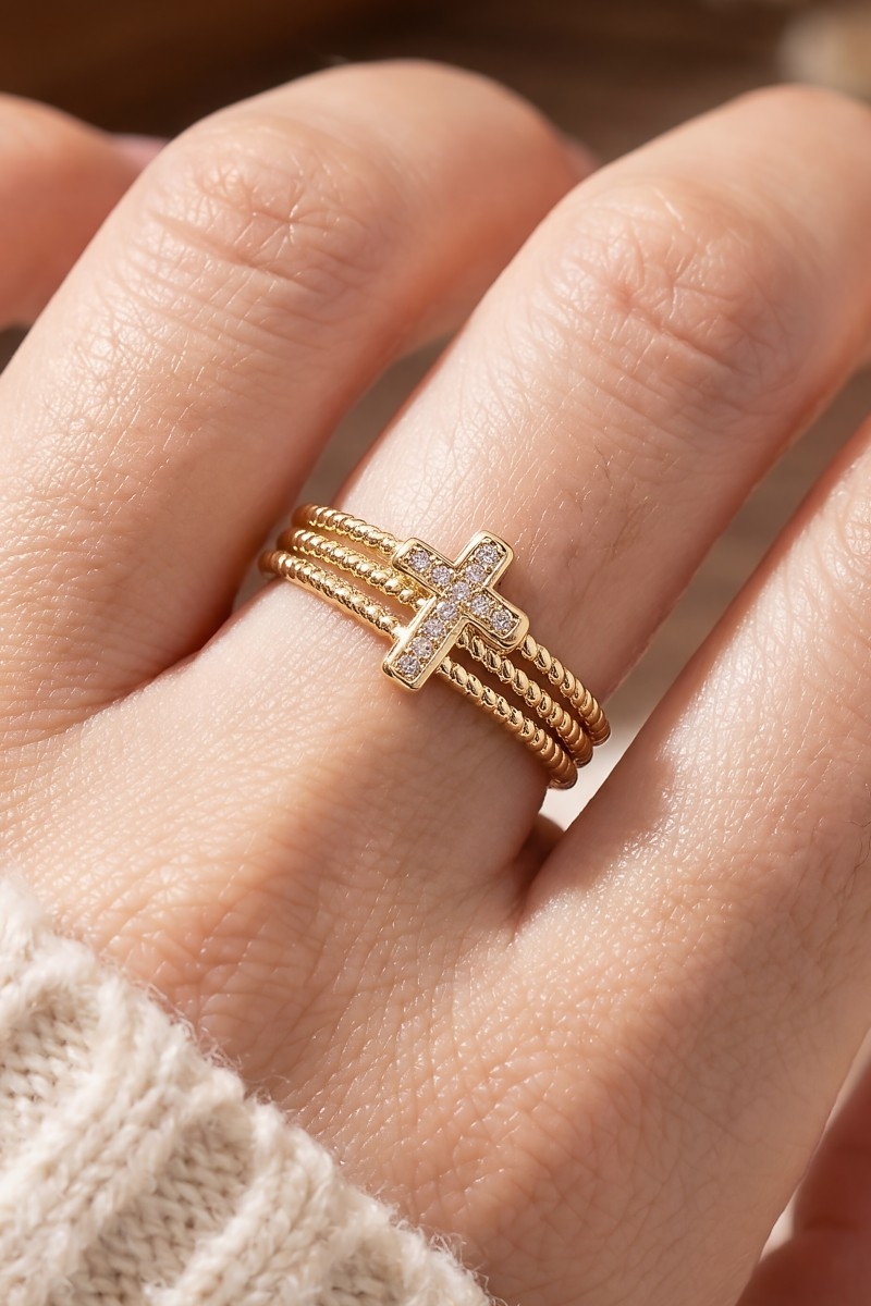 - This ring features a fashionable three row cubic zirconia cross style. Witness the transformative power of accessories as this piece effortlessly redefines your fashion narrative.