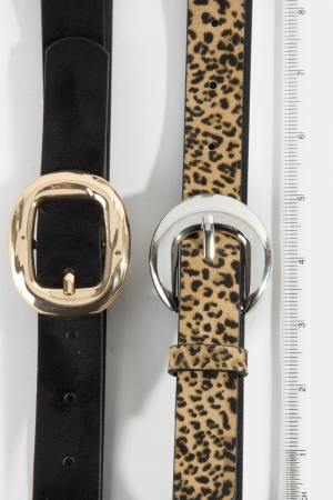 - This belt set displays a fashionable black and leopard print vegan leather style. Embark on a journey of sartorial refinement as this belt set effortlessly complements your fashion sense.