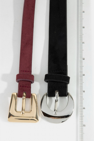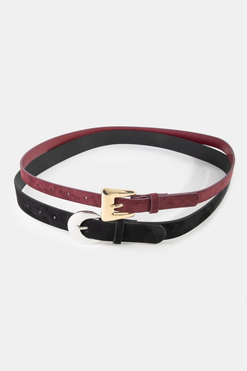 • This belt set brings a stunning vegan leather black and burgandy style. Savor the craftsmanship that goes beyond the ordinary, as this belt set effortlessly captivates attention.