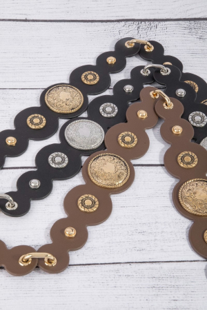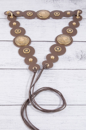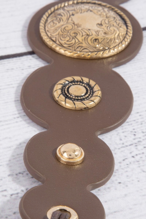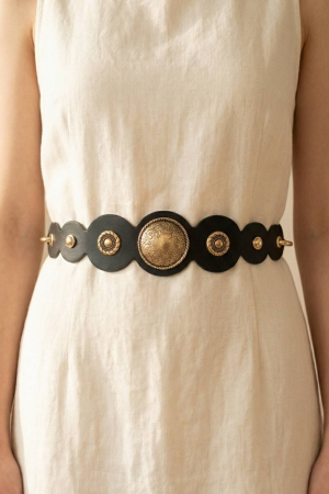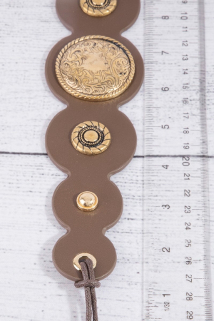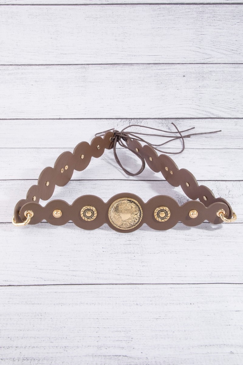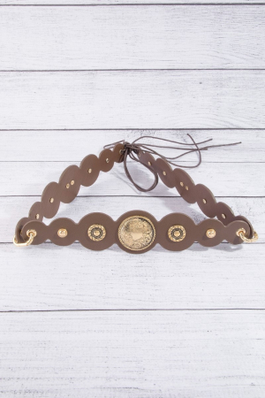 - This belt displays a vibrant western concho disc wrap style. Embark on a journey of sartorial refinement as this belt effortlessly complements your fashion sense.