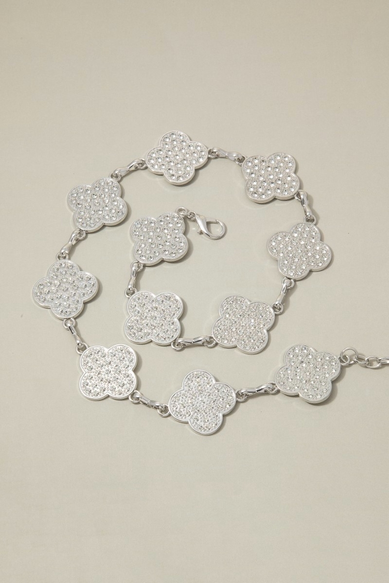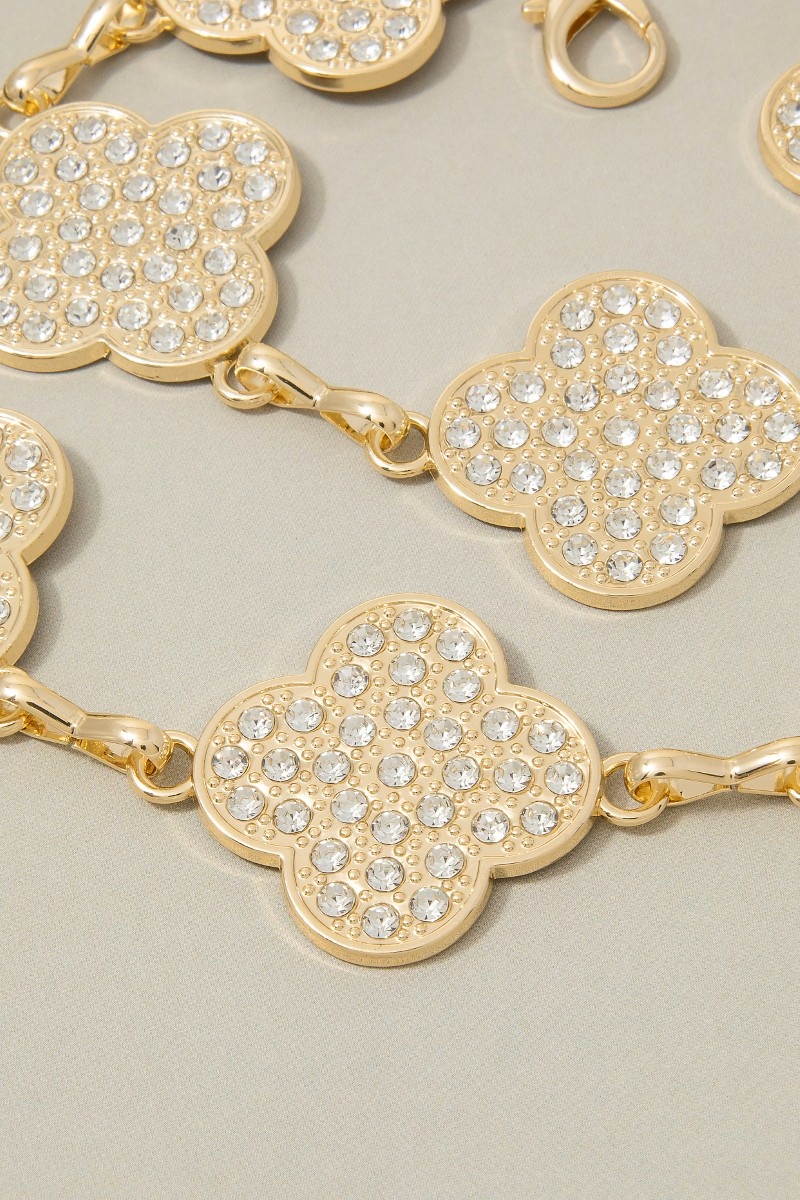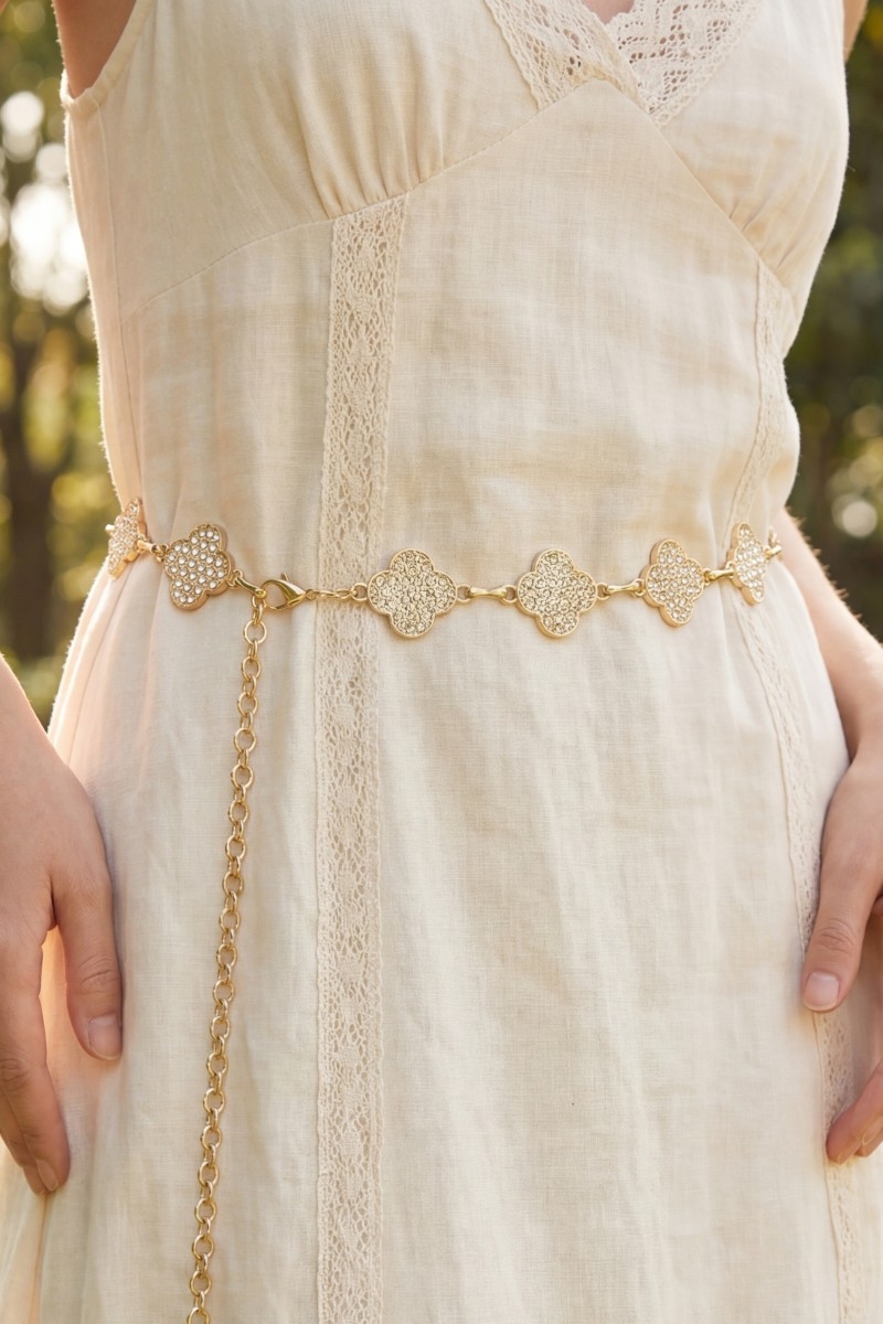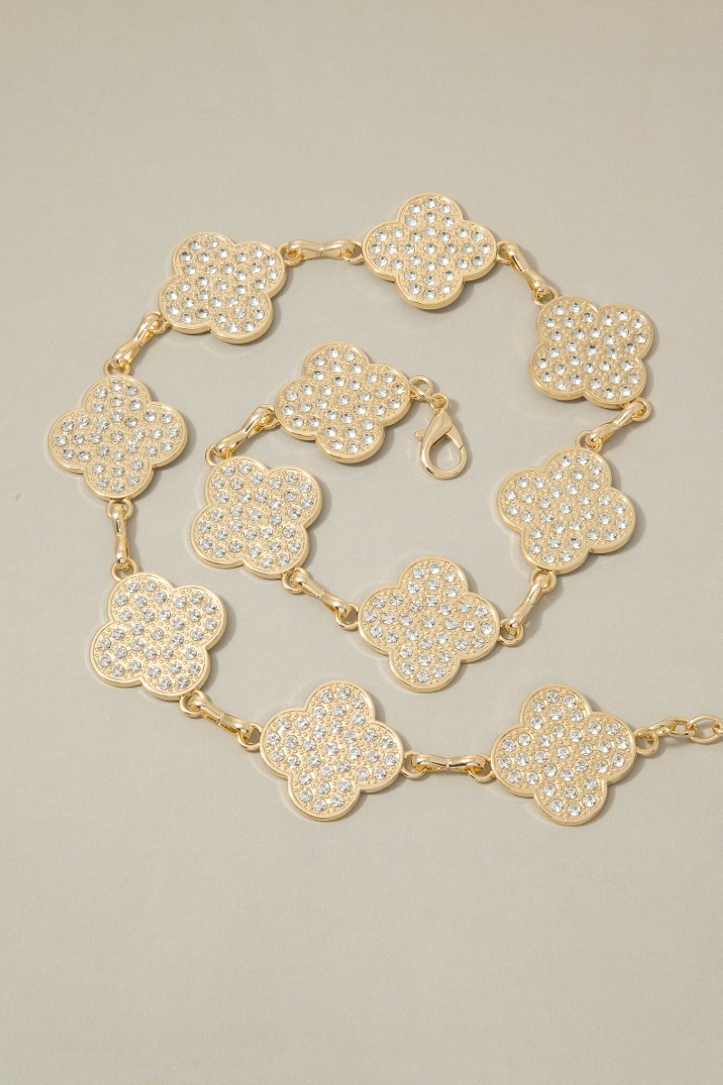 • This chain belt adds a modern gold cubic zirconia pave solid clover link style. Elevate your ensemble with this chic, timeless chain belt.