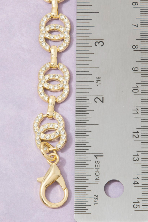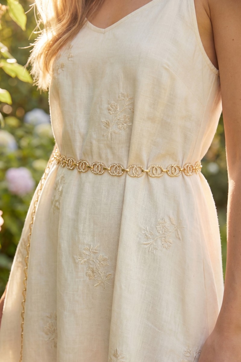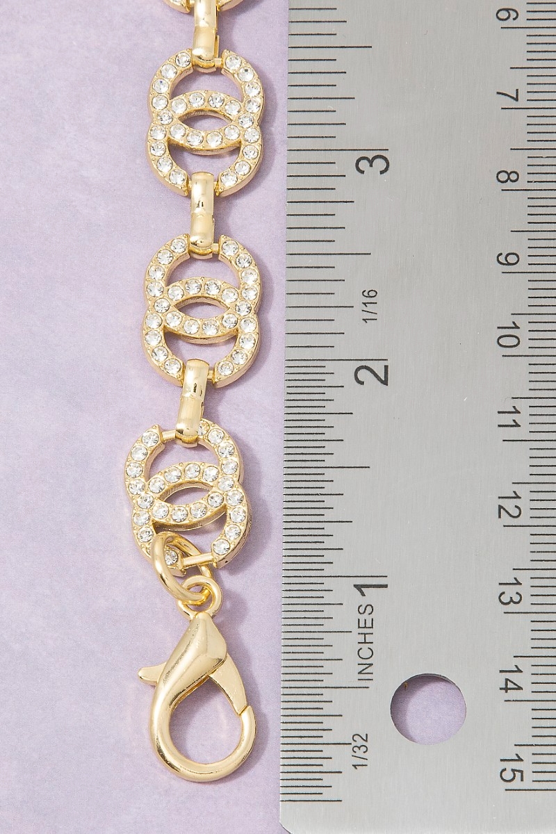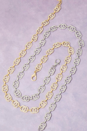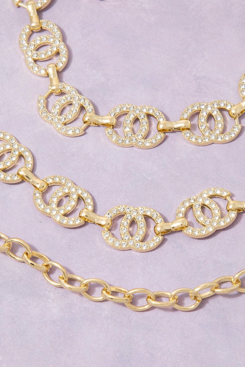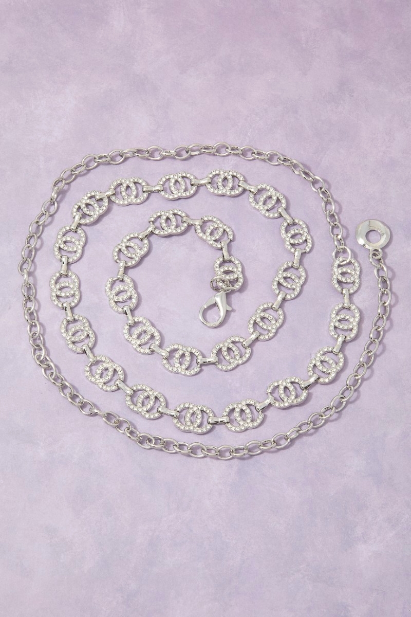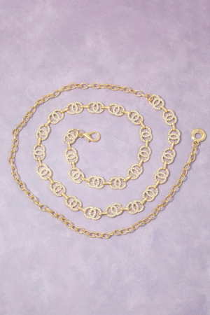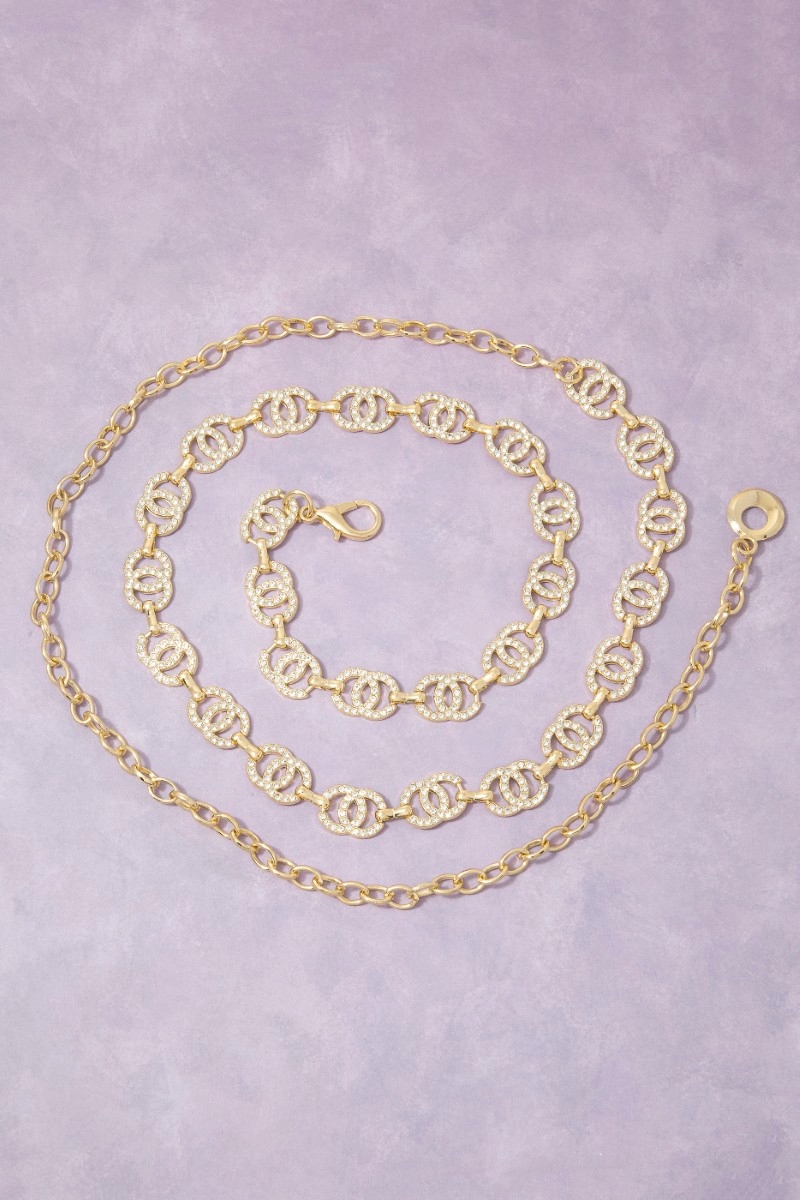 - This chain belt adds a modern gold cubic zirconia double circle link style. Embark on a journey of sartorial refinement as this chain belt effortlessly complements your fashion sense.