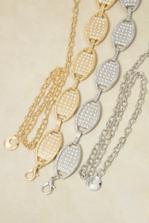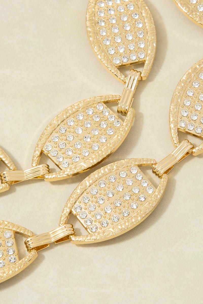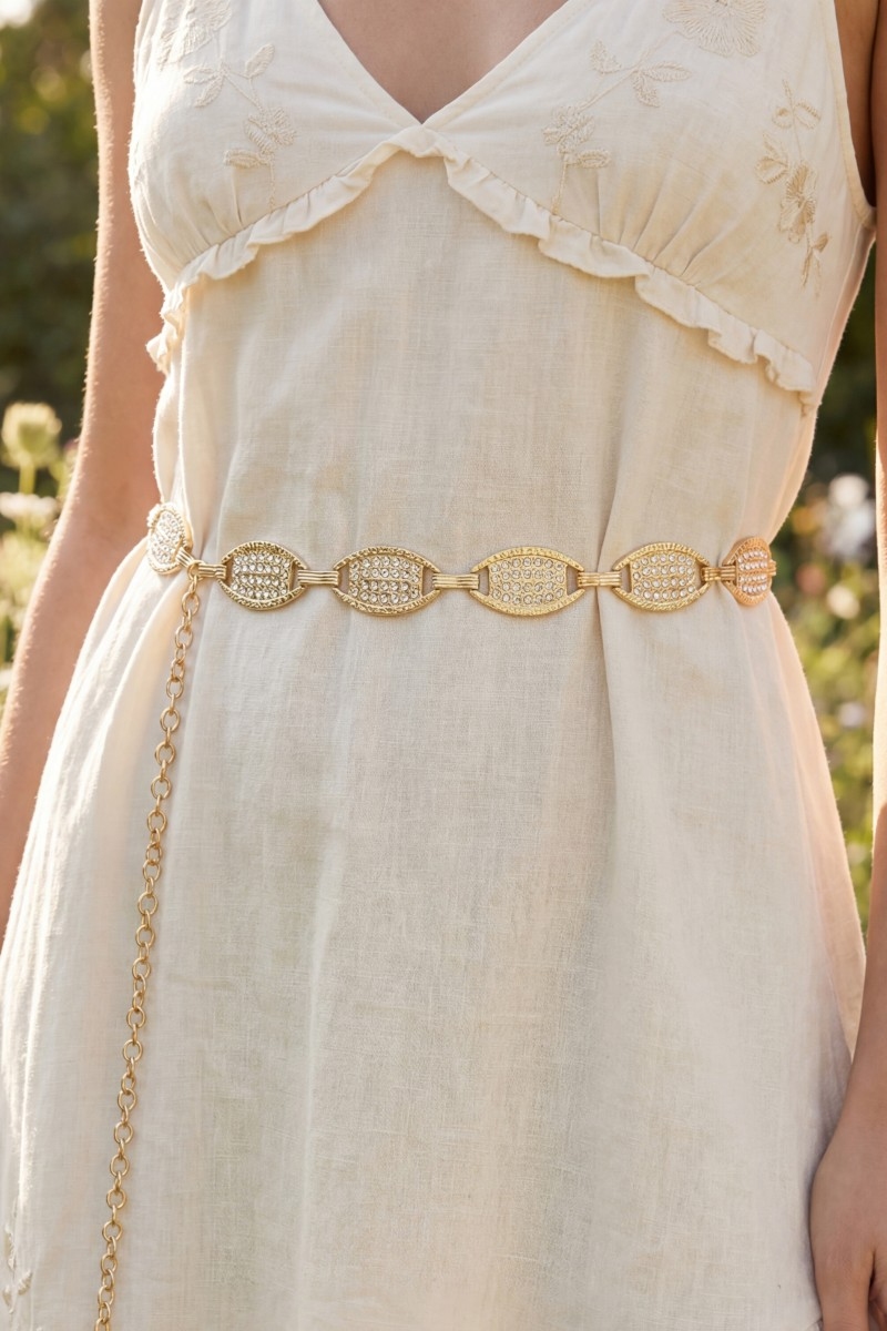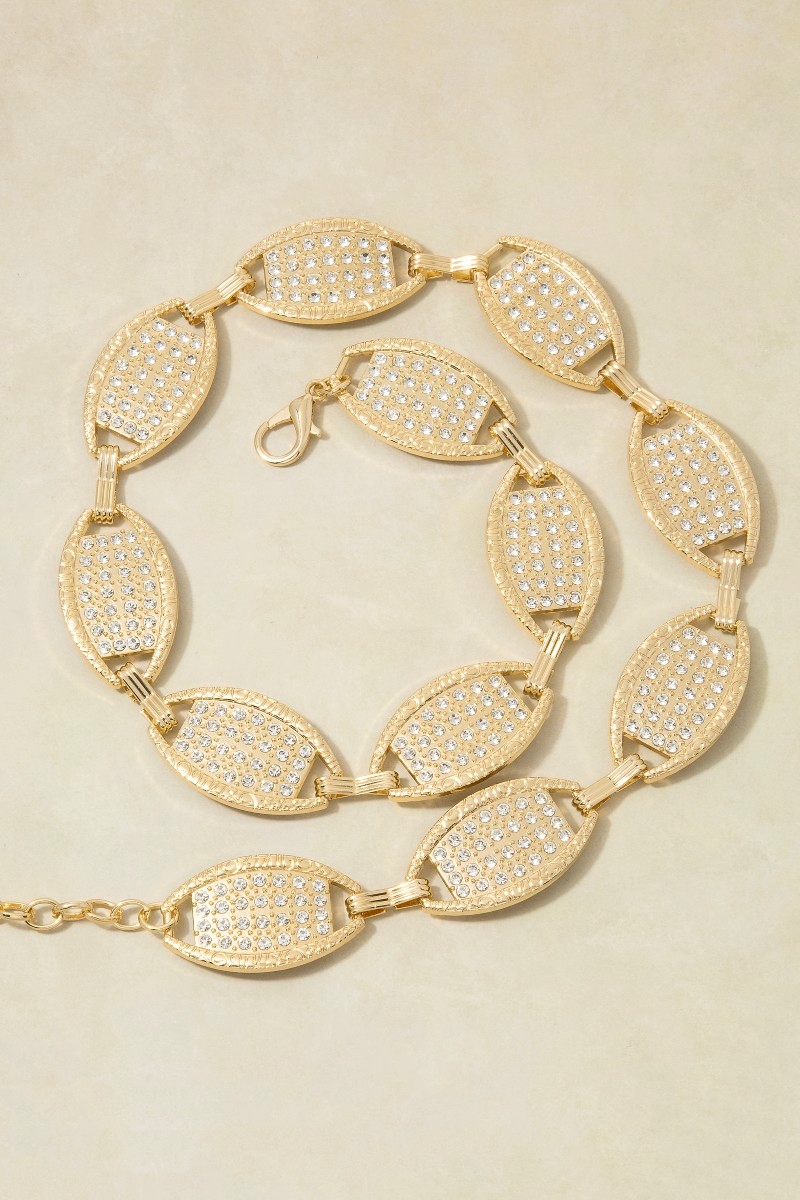 • This chain belt brings a unique gold cubic zirconia pave oval medallion link style. Experience the joy of accessorizing with this piece that effortlessly combines versatility and charm.