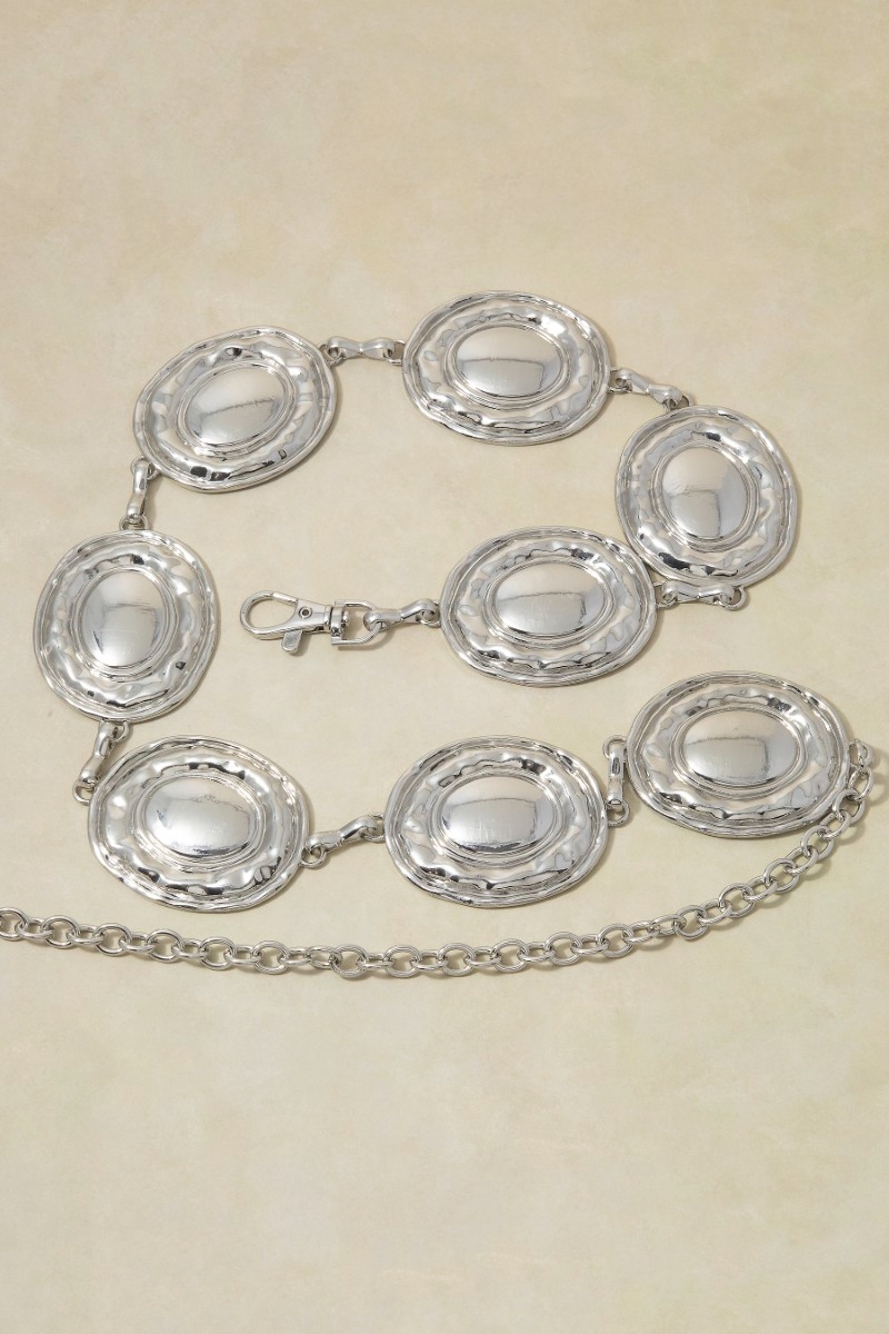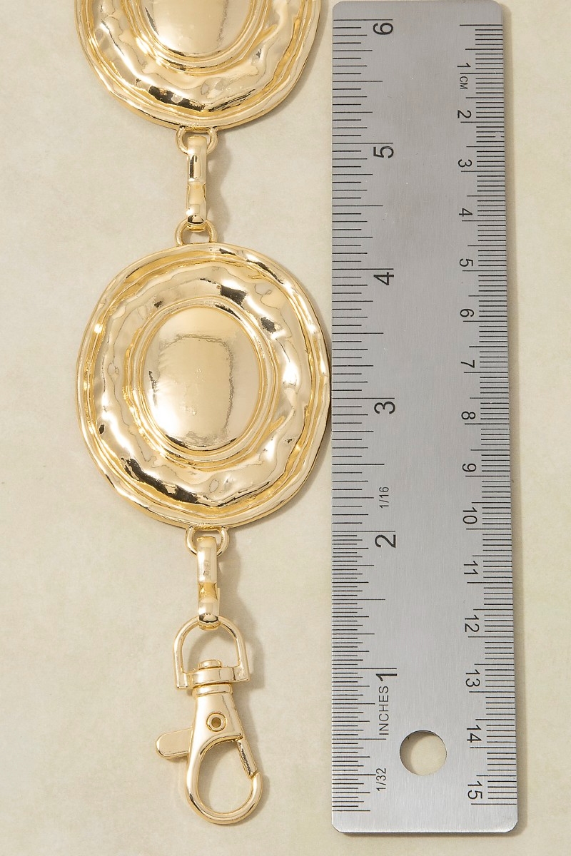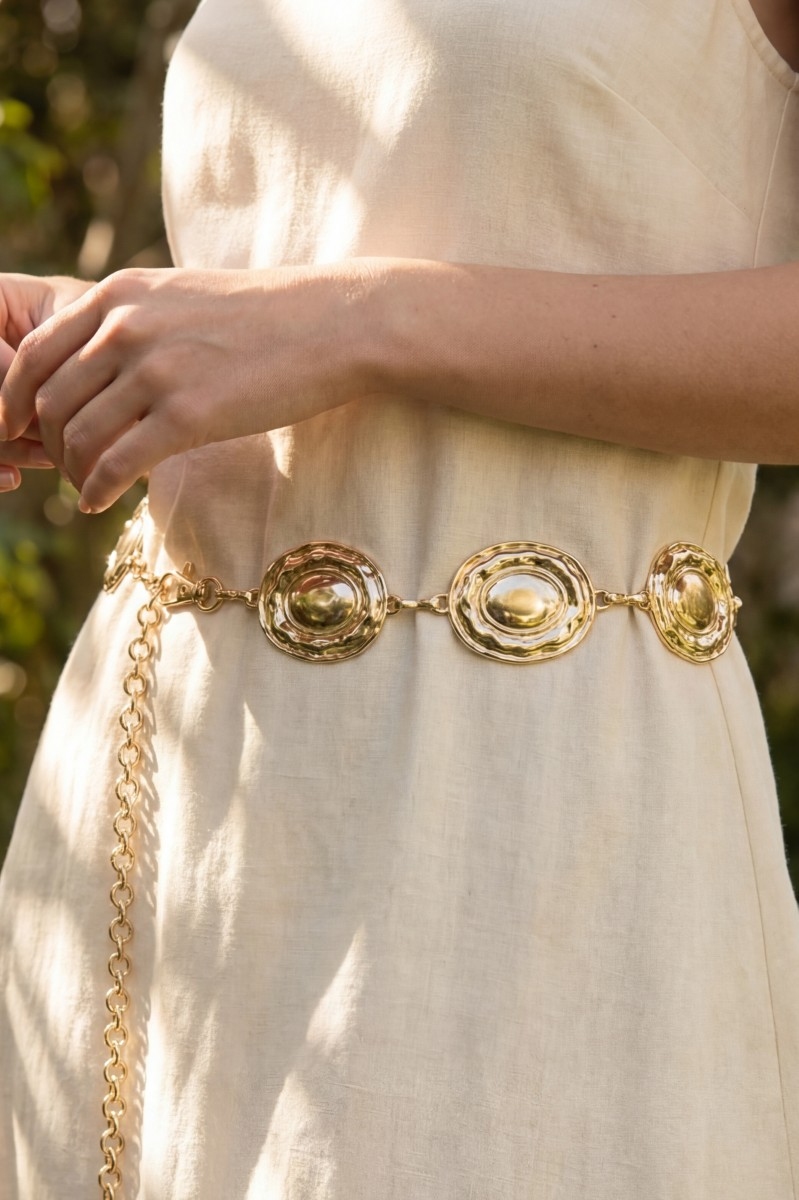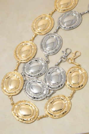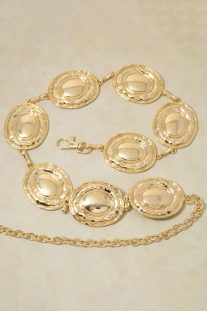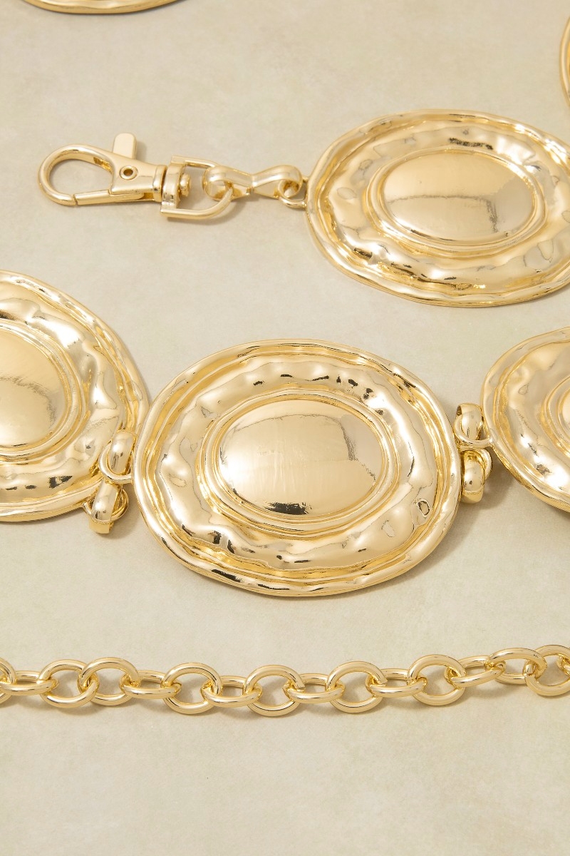 - This chain belt features a fashionable gold hammered dome oval medallion link style. Experience a subtle blend of modernity and classic charm as this chain belt effortlessly adorns your ensemble.